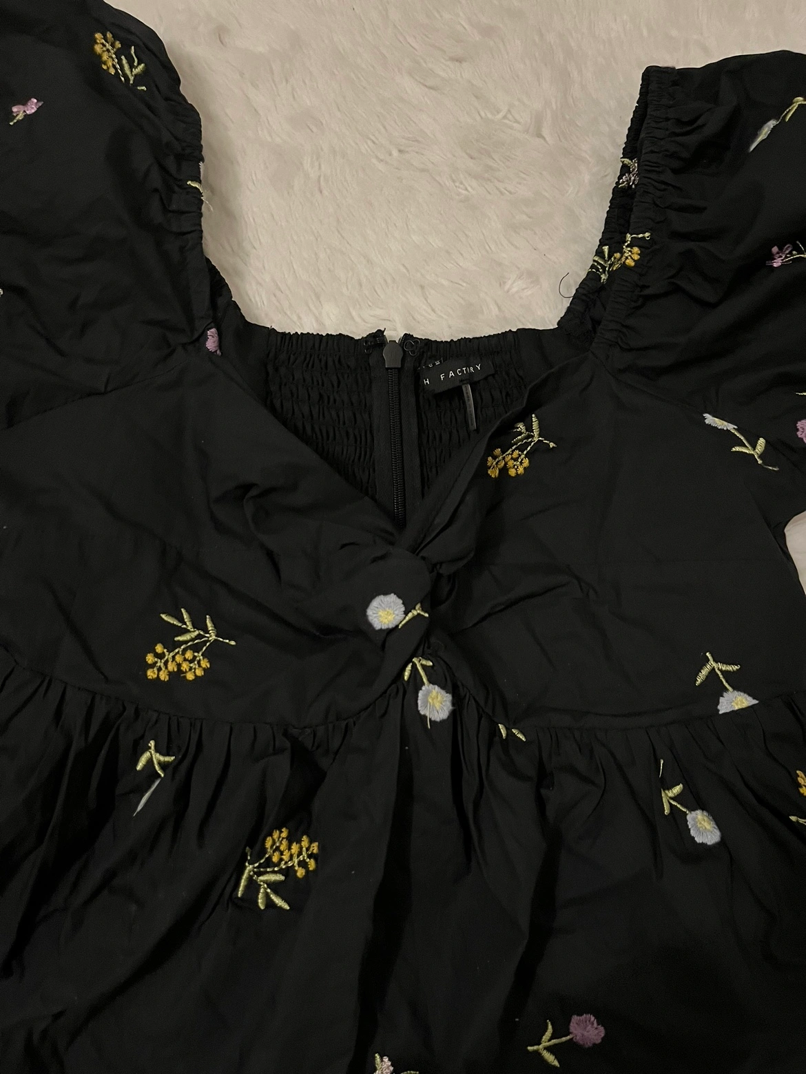 Black short-sleeved top with a floral embroidered pattern. It has a gathered detail at the bust, a square neckline and a back zipper closure. The top has a puff sleeve and an elasticated cuff. It's made of a lightweight fabric 100% cotton/limed, that's perfect for warm weather. It is in excellent condition.