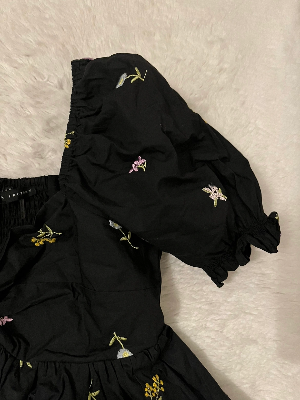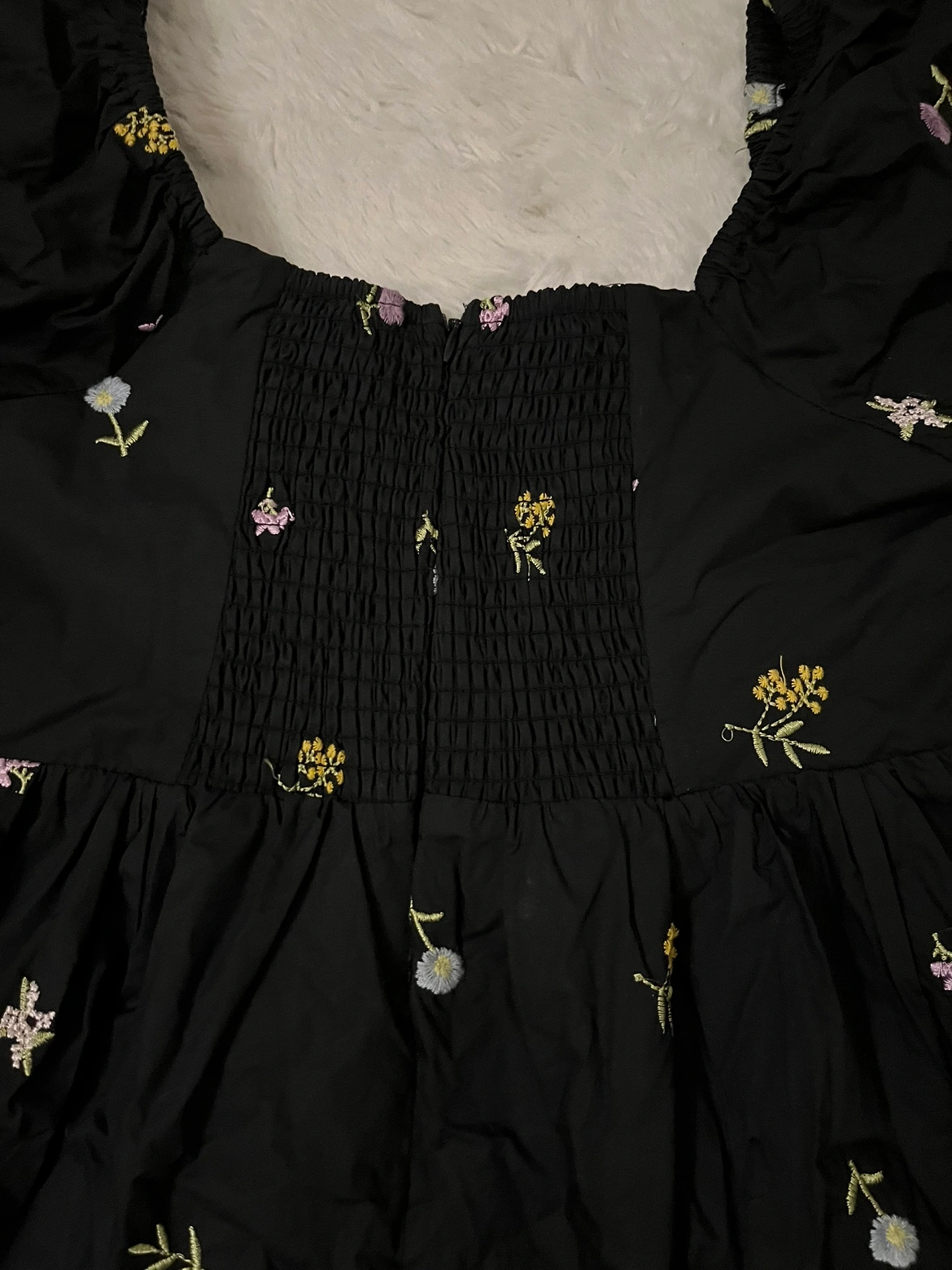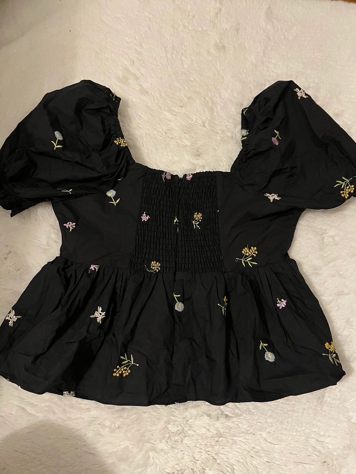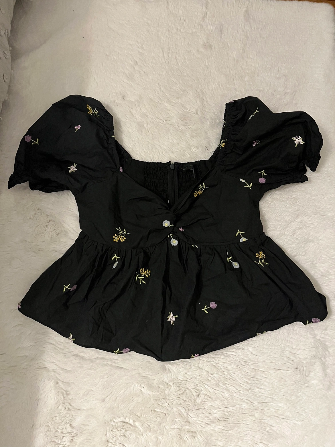 Black short-sleeved top with a floral embroidered pattern. It has a gathered detail at the bust, a square neckline and a back zipper closure. The top has a puff sleeve and an elasticated cuff. It's made of a lightweight fabric 100% cotton/limed, that's perfect for warm weather. It is in excellent condition.