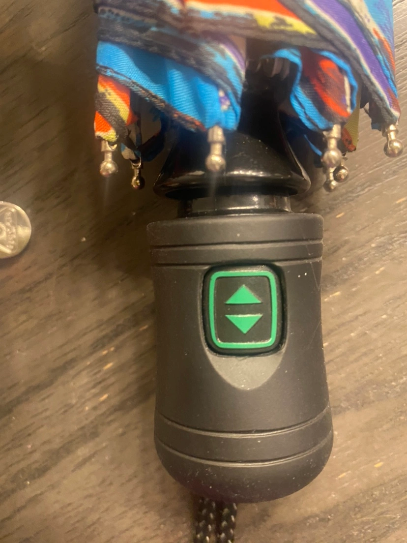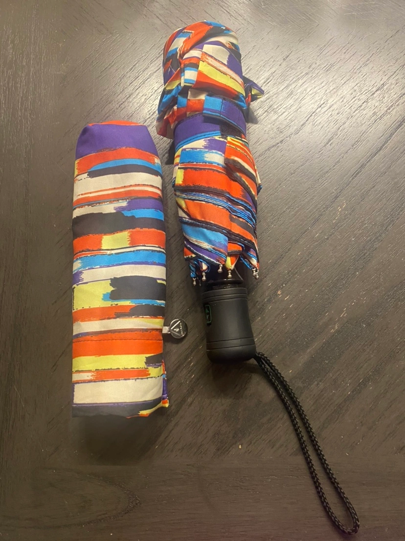 A multicoloured striped umbrella with a black handle. The umbrella has an automatic open and close feature. It comes with a matching carrying case.
