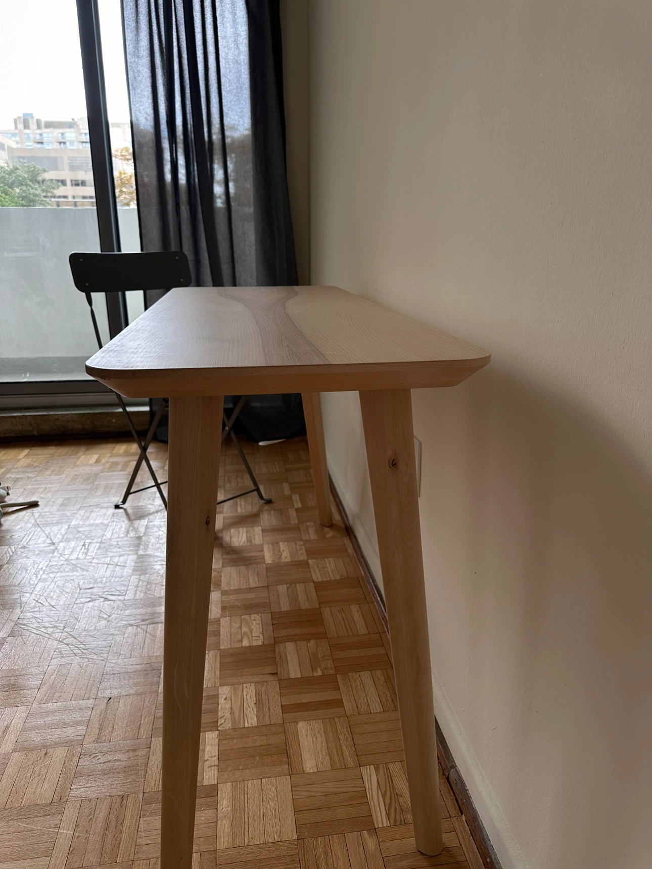 A small wooden table with a unique grain pattern. It has four legs and is perfect for a small space. It comes with two chairs. It is great for a small apartment or for a small study area.