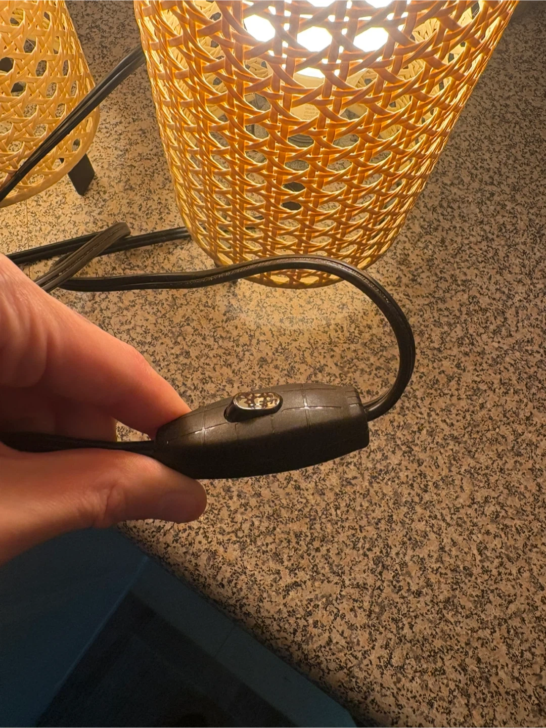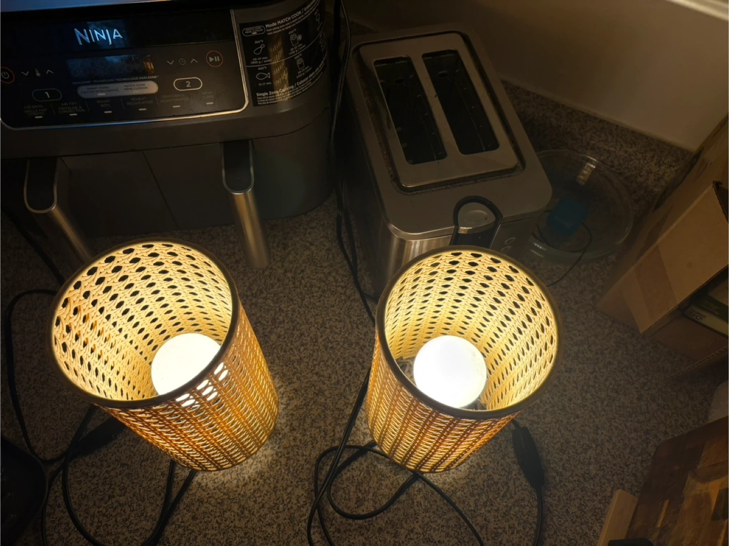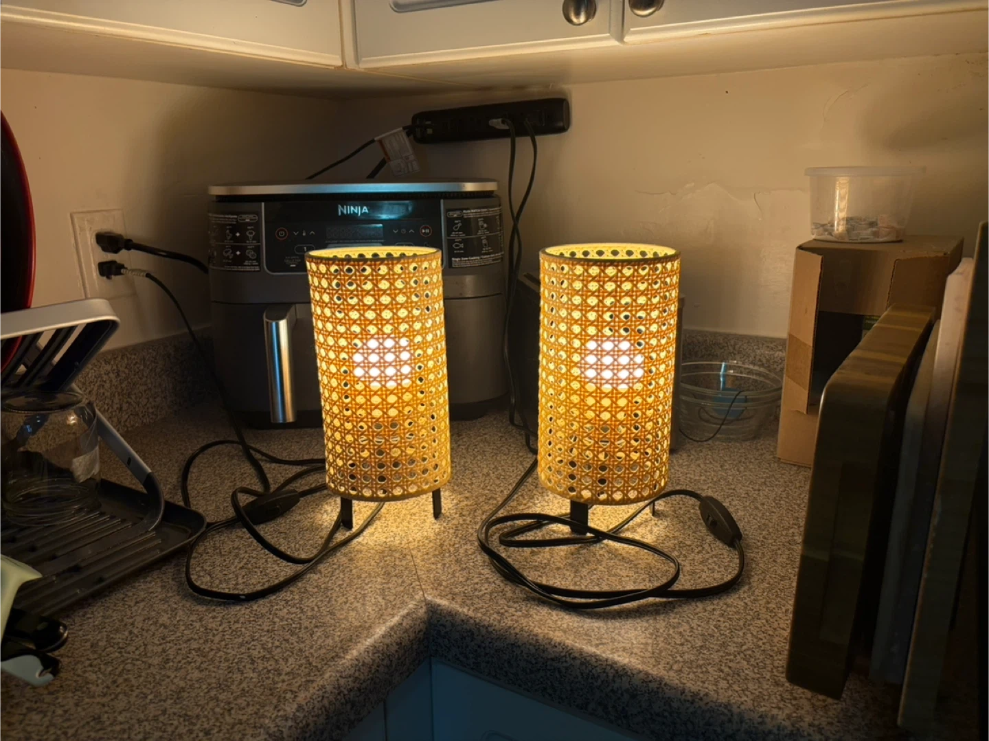 Selling a matching pair of IKEA table lamps with woven-style shades (SAXHYTTAN Table lamp). They give off a very cozy warm light and are perfect for bedside tables, desks, or mood lighting in a living room.