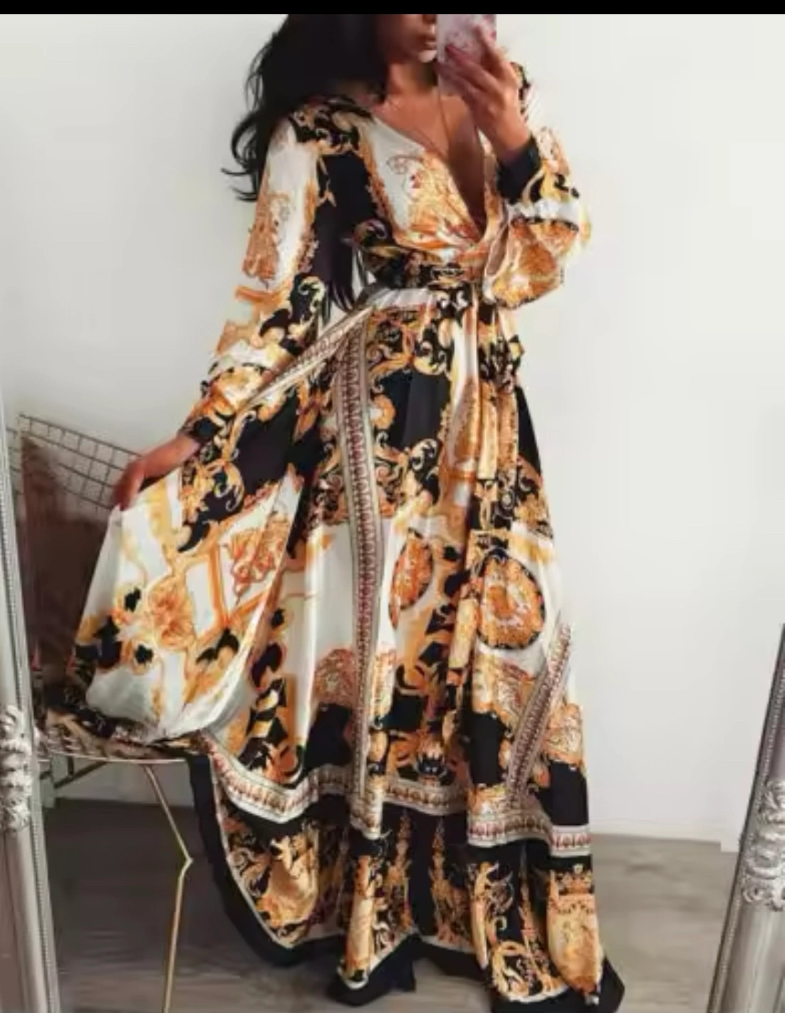 86This dress features a V-neckline, long sleeves, and a flowy skirt. It is made of a comfortable and lightweight fabric. The dress is perfect for a variety of occasions, from casual outings to special events.