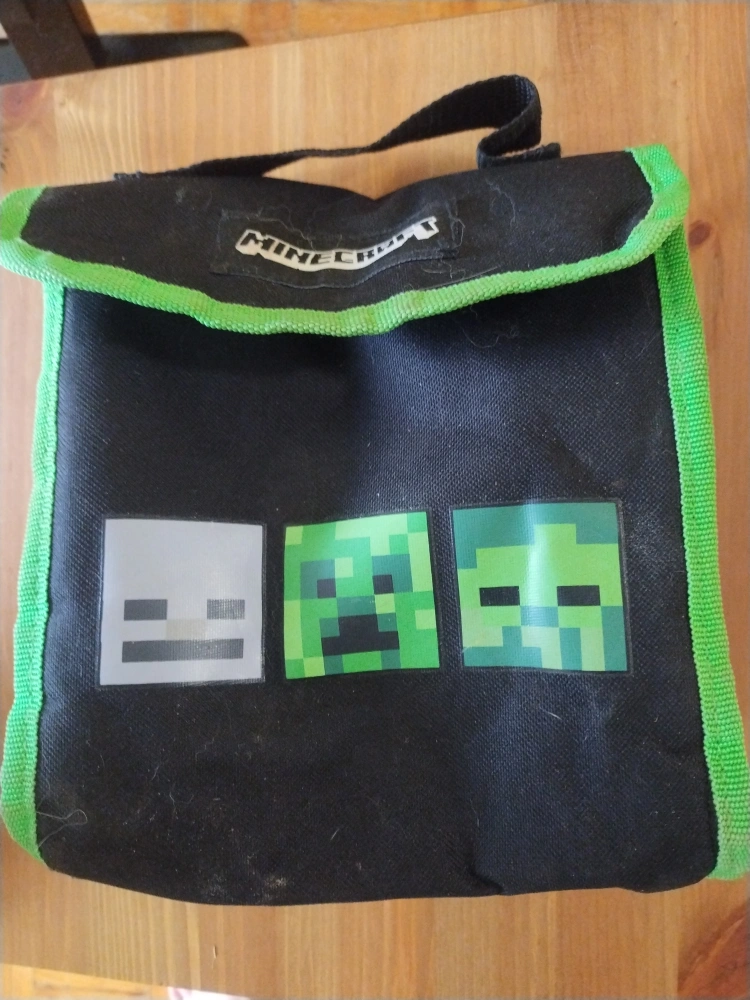 1000+Black lunch bag with a green trim, featuring Minecraft characters. It has a handle and a velcro closure. used but still in fairly good condition
