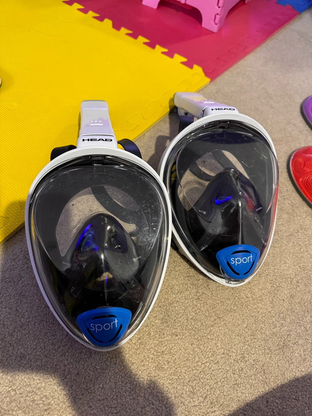 Two full-face snorkeling masks. They are both in the HEAD Sport model. Both masks come with the snorkels. The masks have been used but are in good condition.