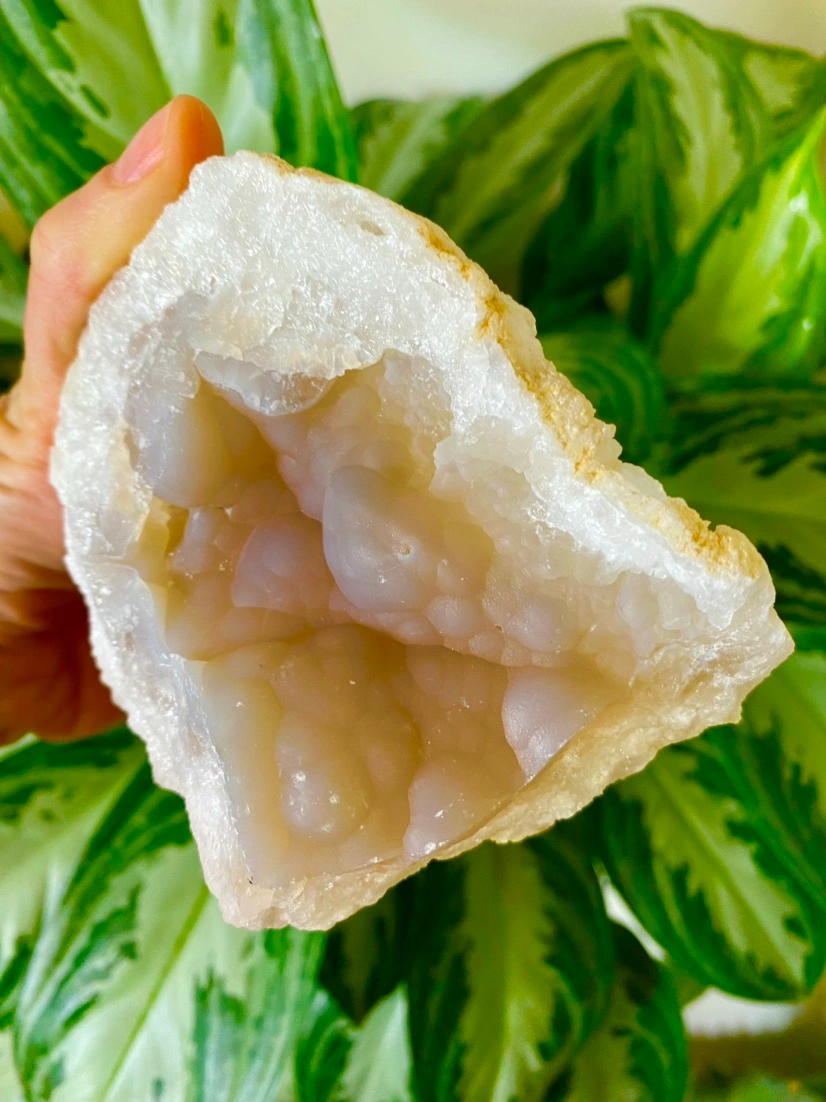 Chalcedony Geode is a micro crystalline type of quartz occurring in several different forms, including onyx, agate, and jasper. Chalcedony is a nurturing stone that promotes brotherhood and good will. It absorbs negative energy. Chalcedony instills feelings of benevolence and generosity. It alleviates hostility and transforms melancholy into joy.
