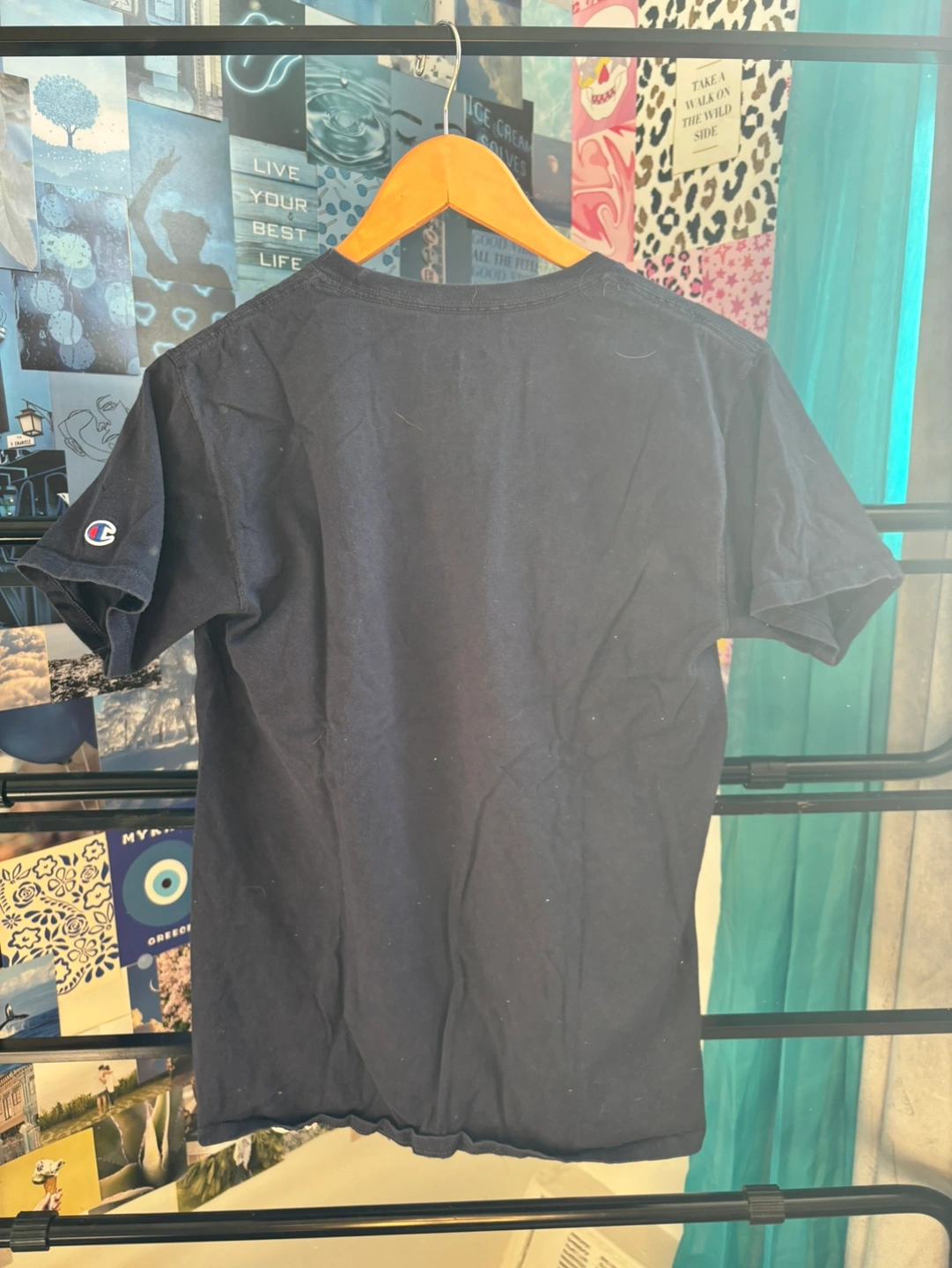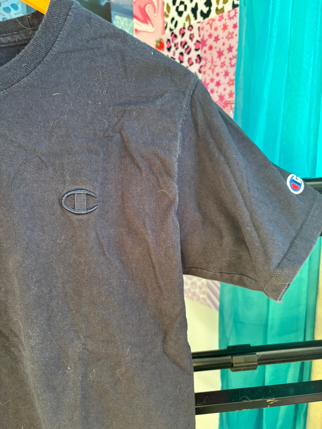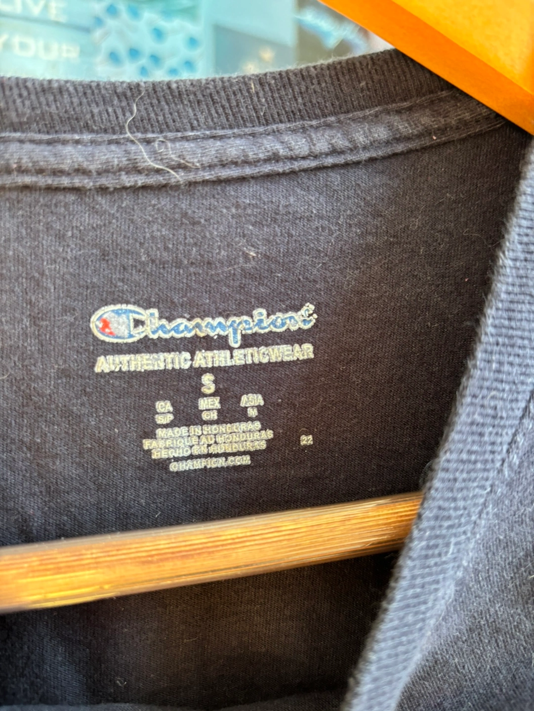 Size Small, navy blue with embroidered logo on the front and Champion logo on the sleeve.