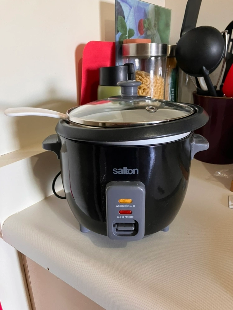 Black Salton rice cooker with a glass lid, a small rice cup and a serving spoon. Also included a stemming tray. As see in photos . No instructions included.