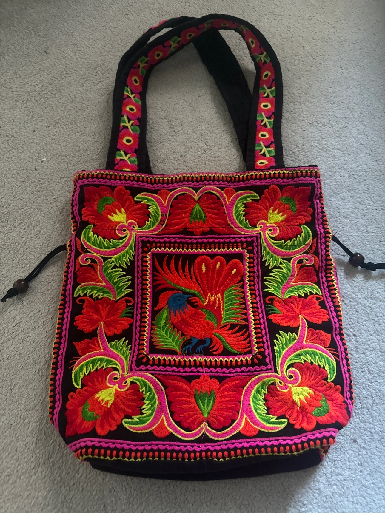 This is a colourful tote bag with a zipper closure. It is a great size for everyday use and has a long shoulder strap. It is made of a black canvas and has a colourful embroidery design.