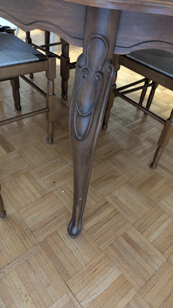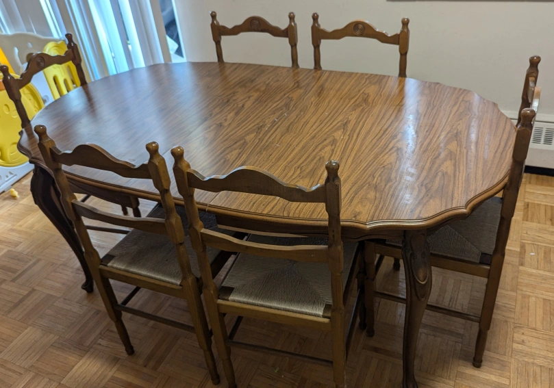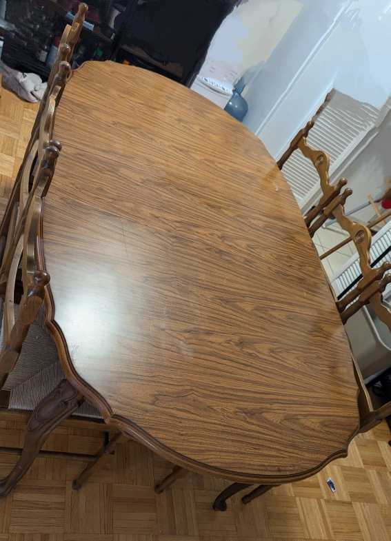 Oval solid wood table with leaf. There is a stain on the top that was already there when I got it. Since I always used with a table cloth, didn't bother or change the functionality of the table.