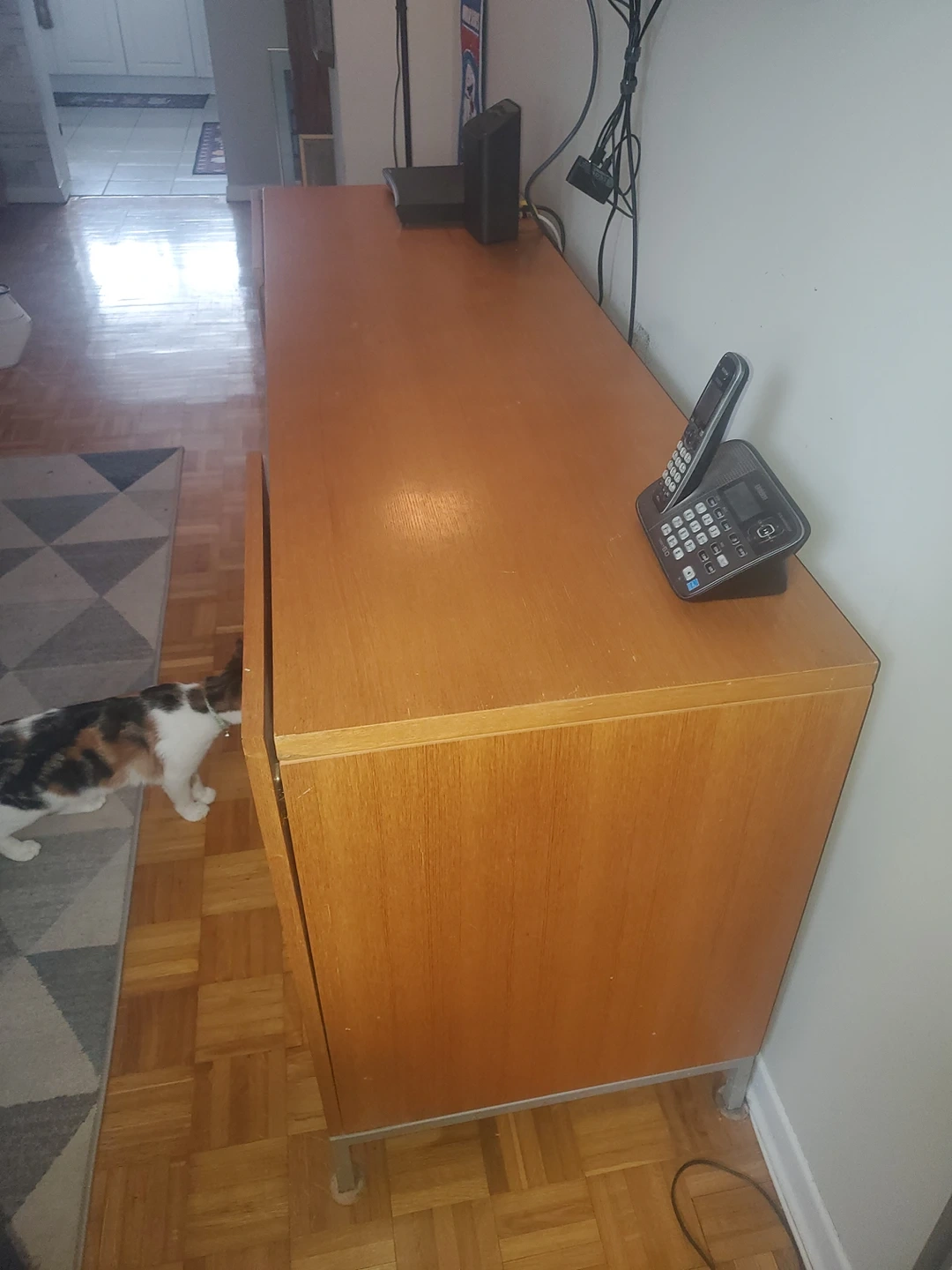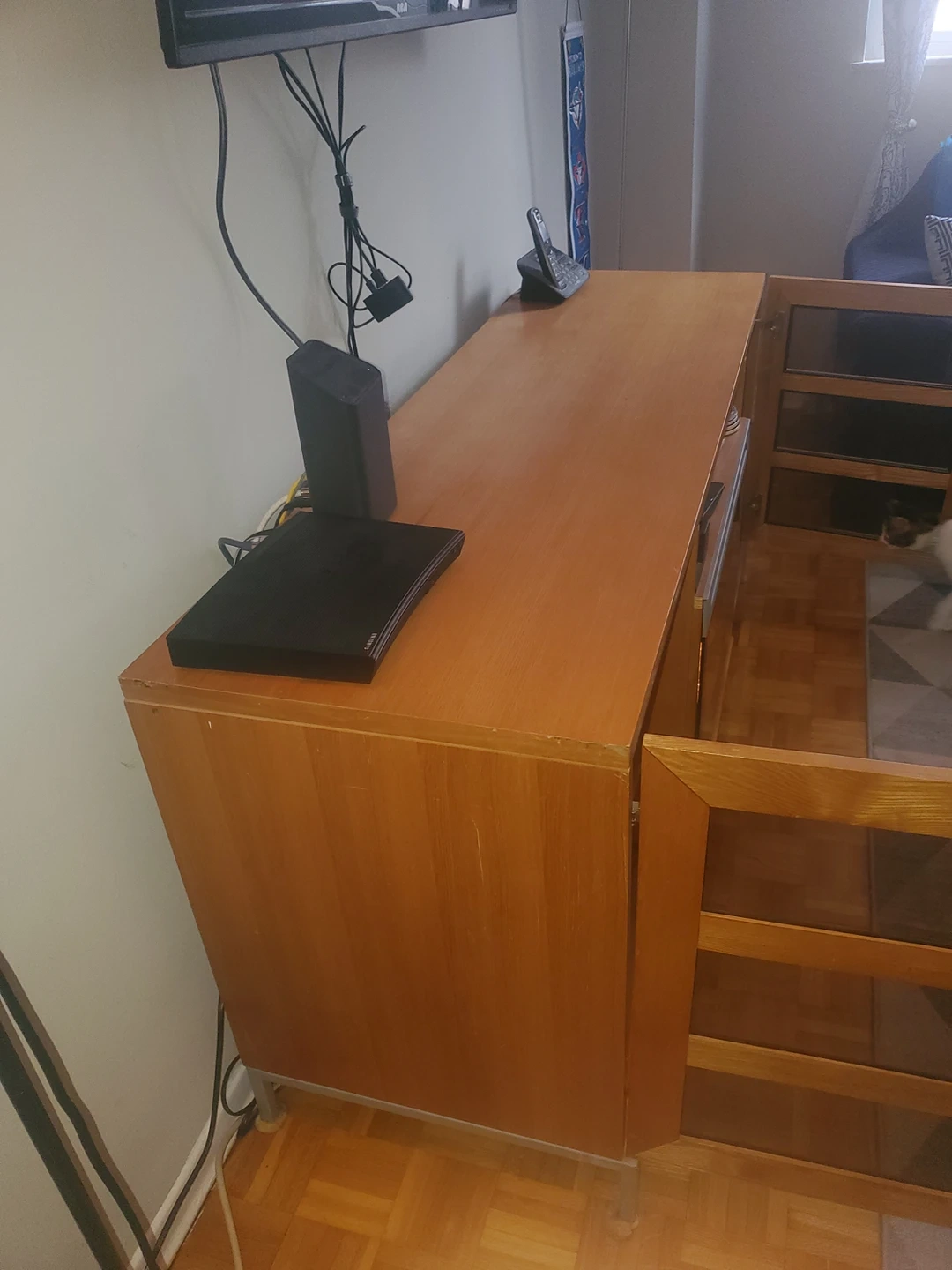 unit is around 15 years old. Has remote control. Unit also has some scratches on it. Takes 2 people to carry. Will fit in van or pickup