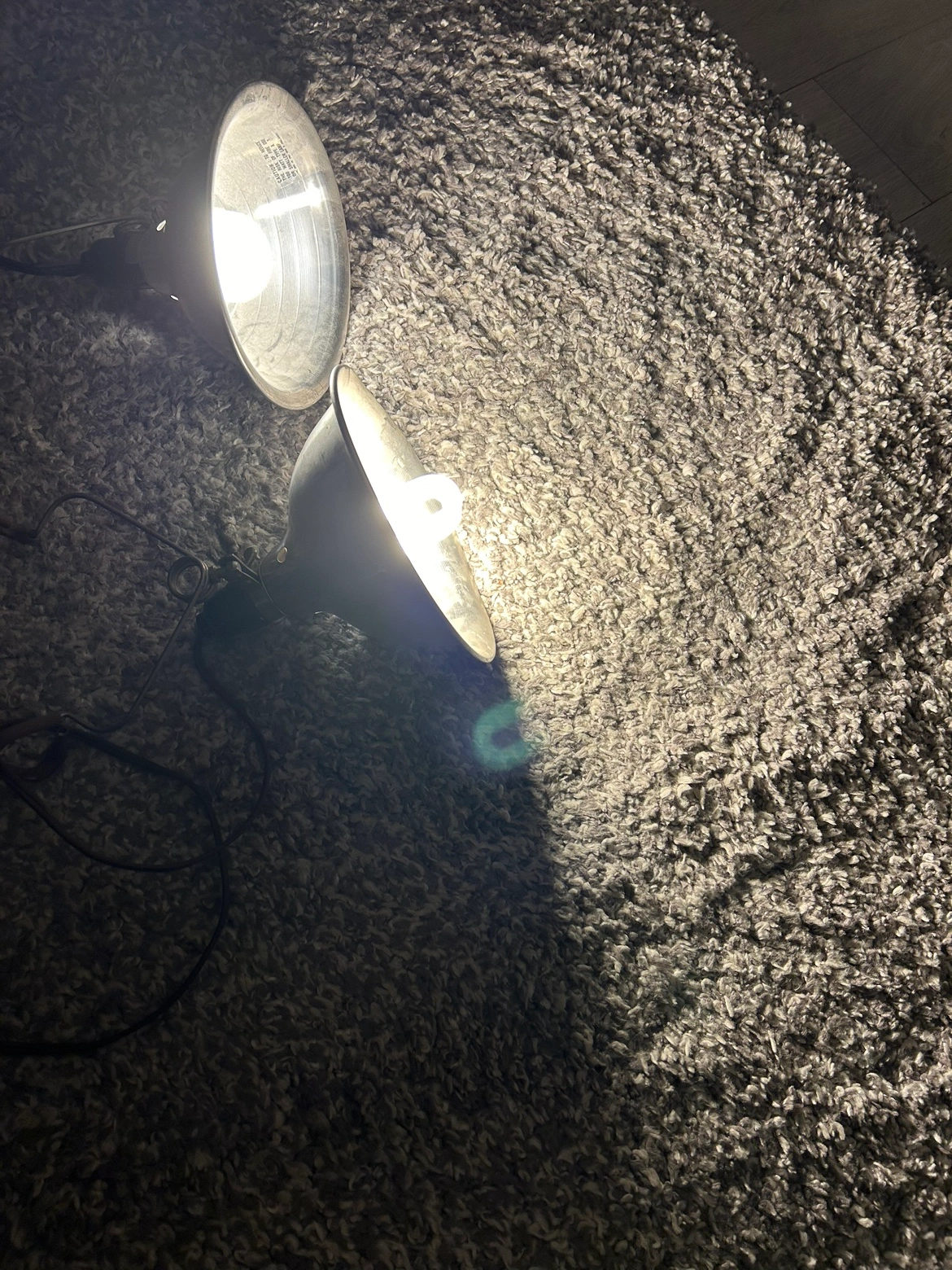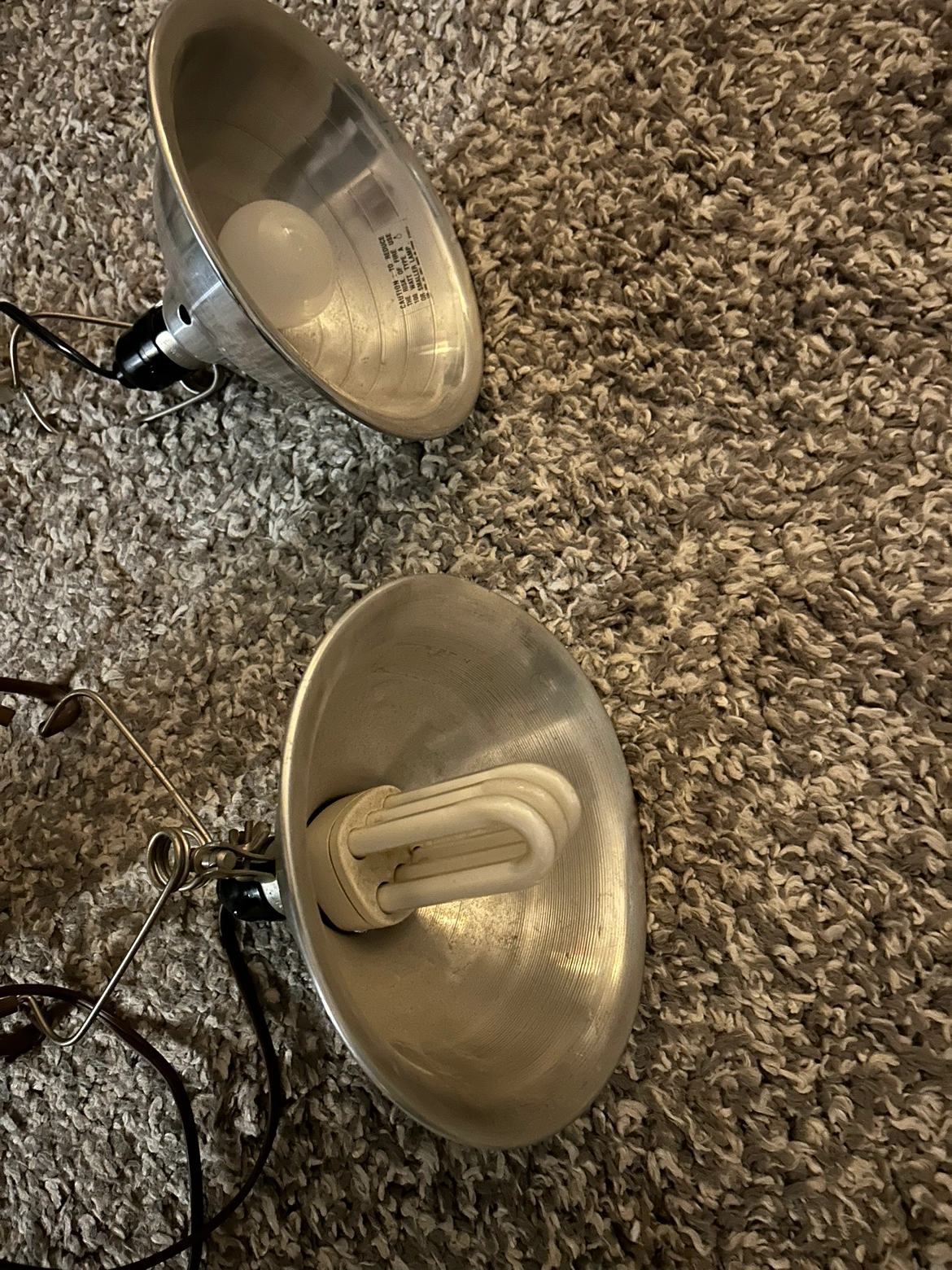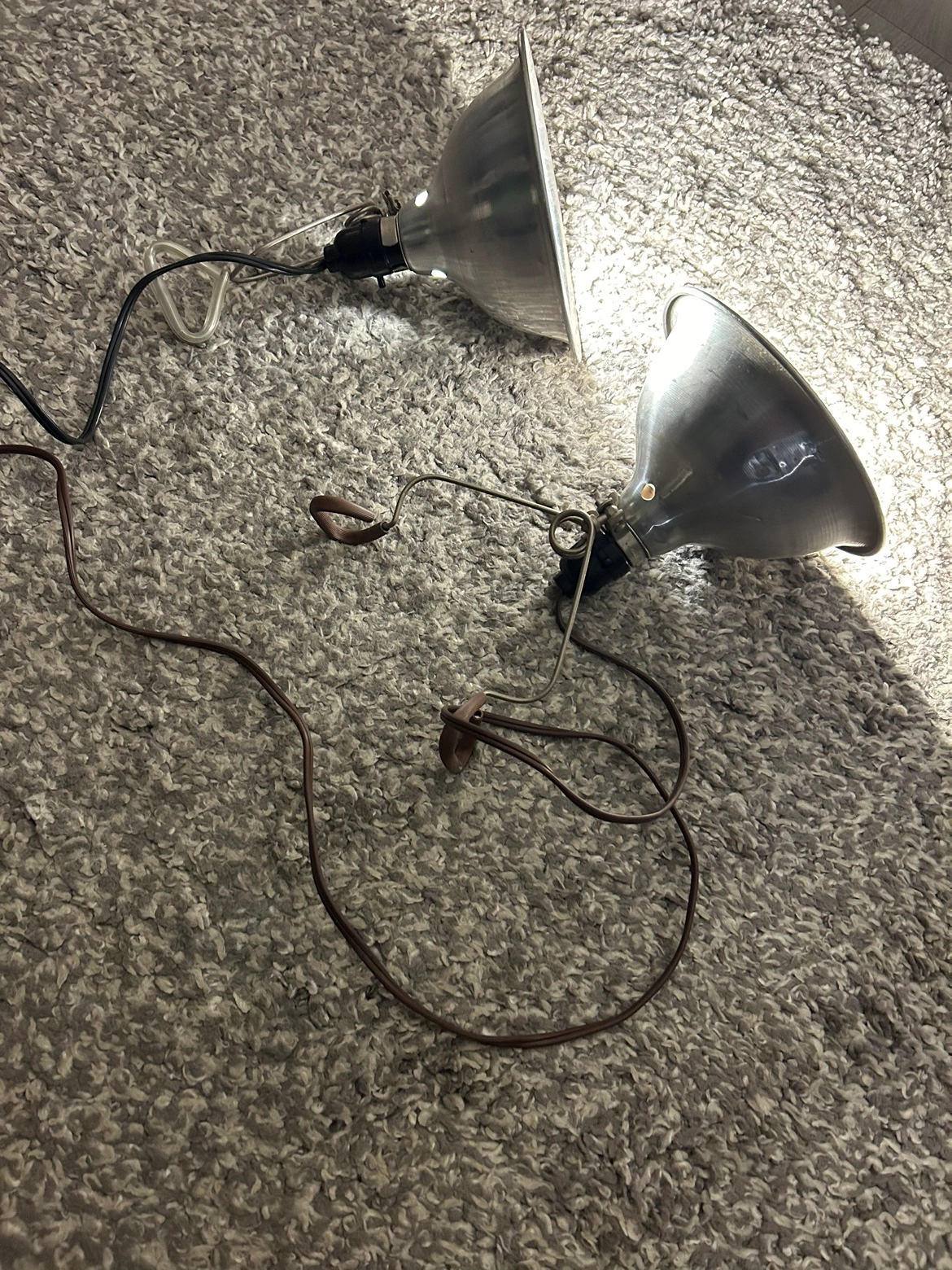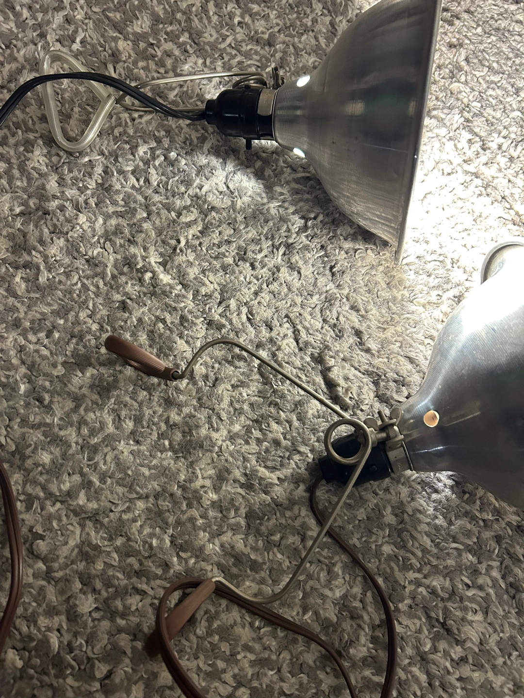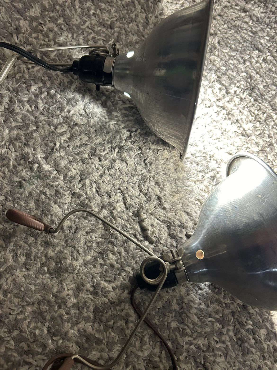 Set of two vintage work lamps with adjustable arms. Each lamp has a standard light socket. Includes two bulbs. The bulbs are bright. Can be used in a workshop or garage space as well