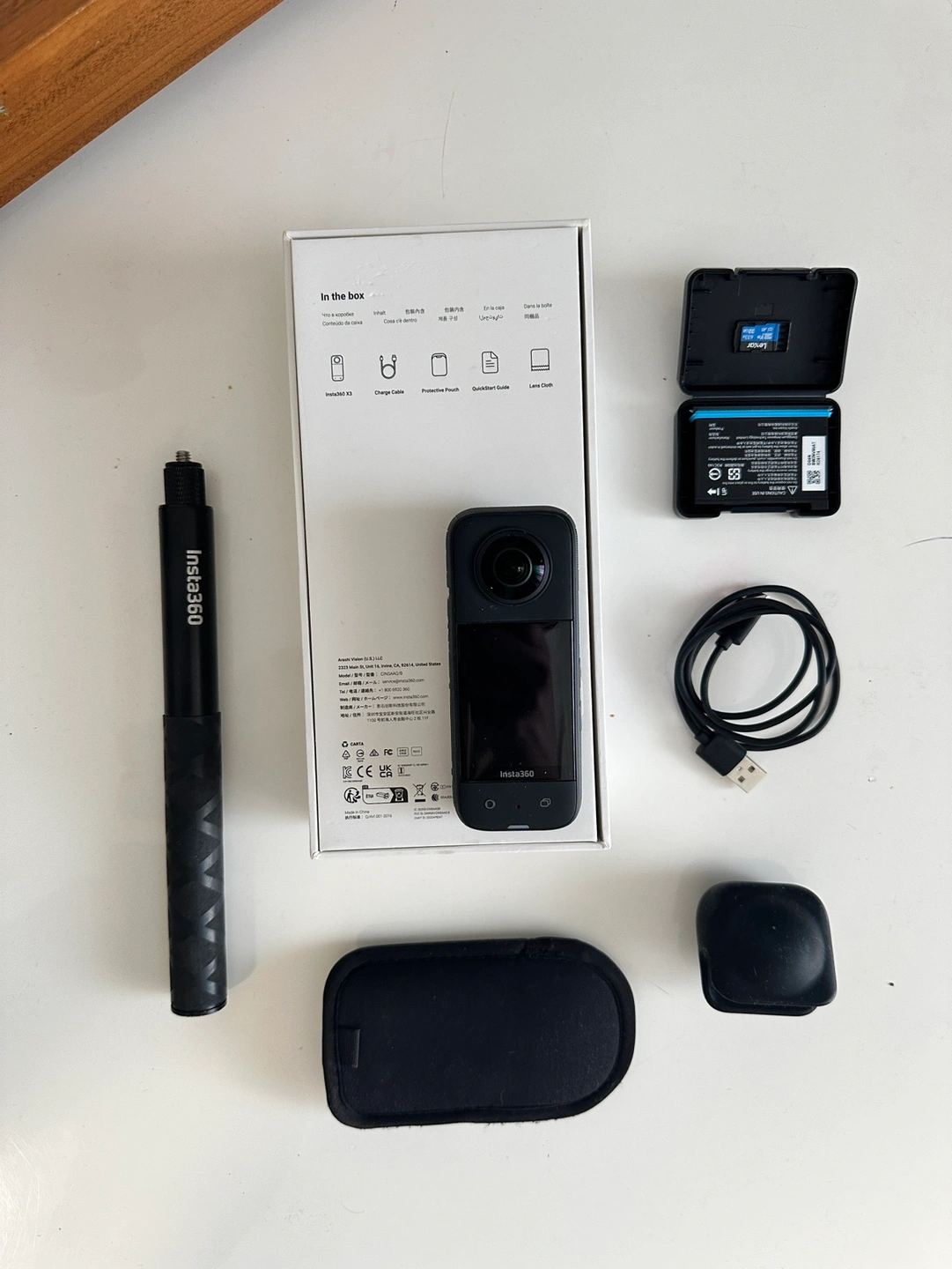 Includes camera, case, charging cable, invisible stick, SD card, extra battery and original box.