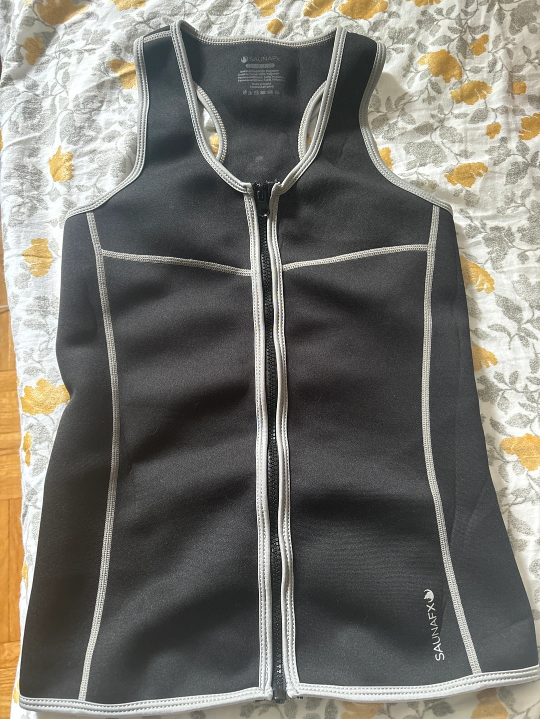 Black tank top with zipper in front and grey trim. It says SaunaFX on the bottom of the tank top. Small/ medium size