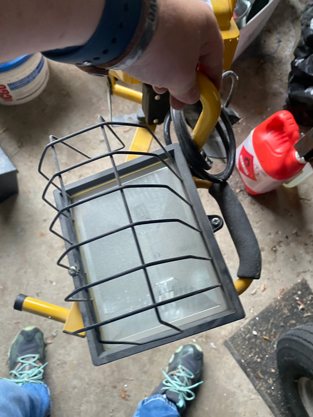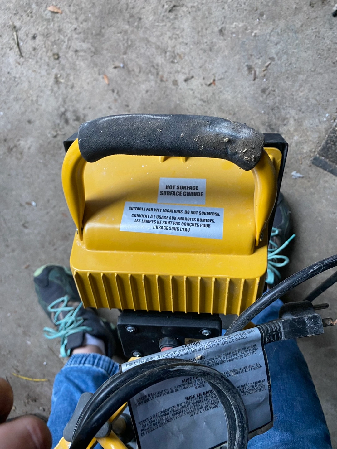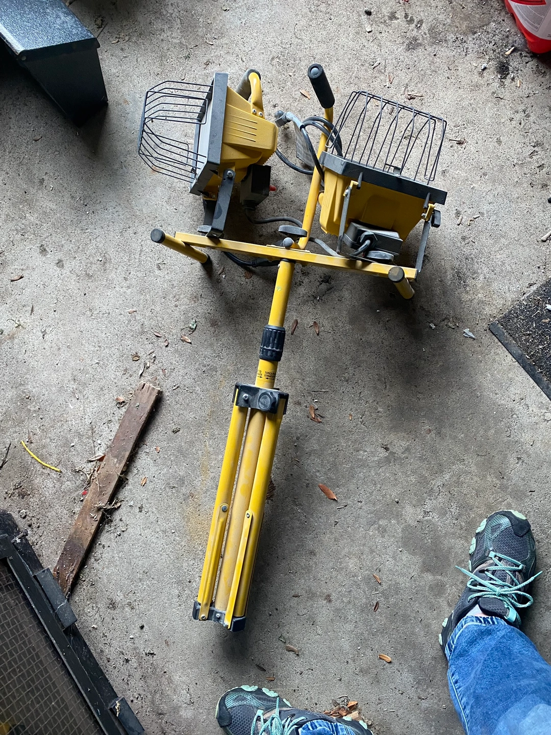 13A work light stand with two lights. The stand is yellow and the lights have metal cages. The lights have a handle and a cord. Pick up near Weston Rd and Wilson or Jane and Wilson. I have more construction work safety clothing and accessories available for sale.