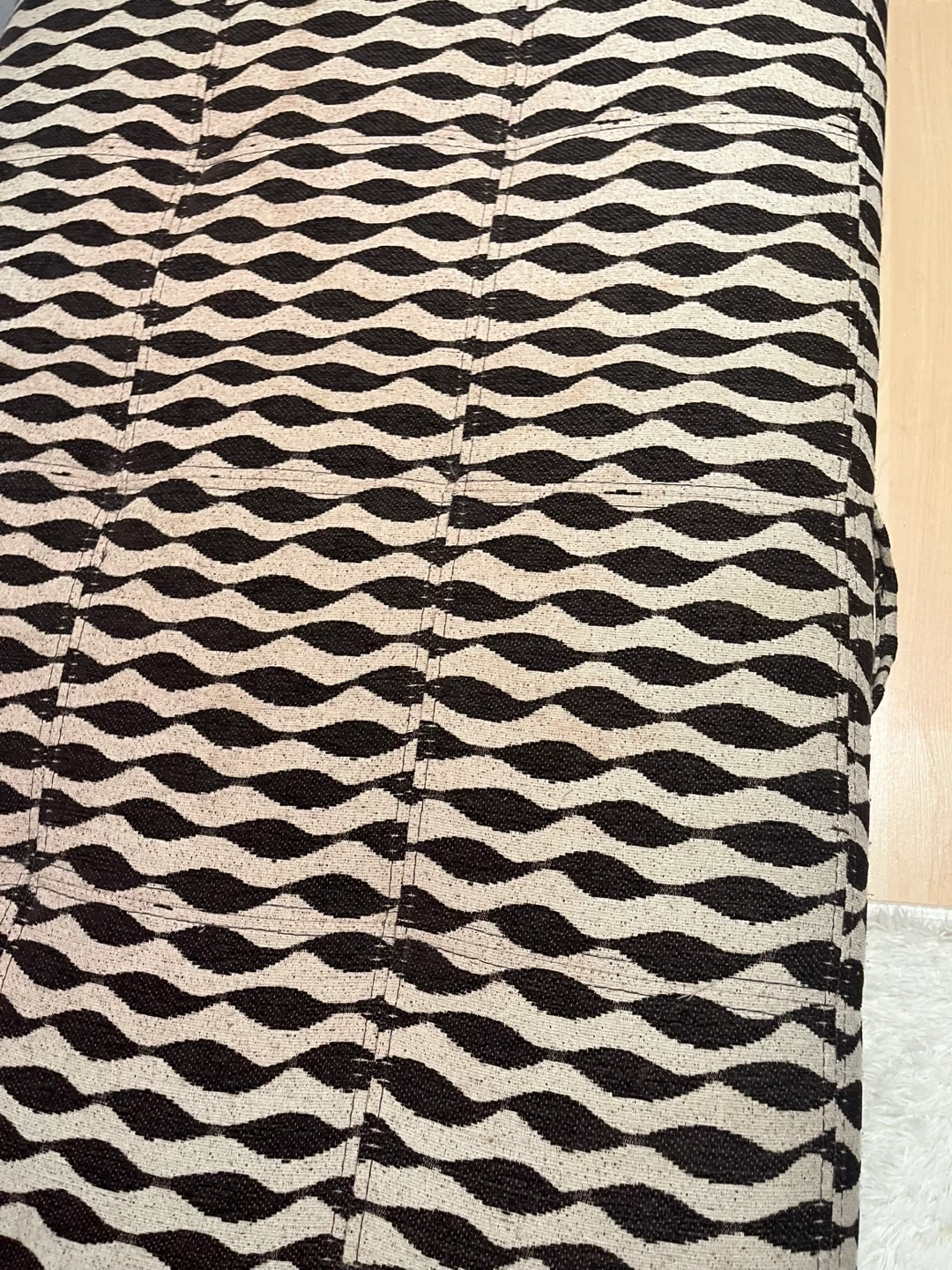 This storage ottoman features a stylish chocolate brown and beige geometric wave pattern. It's upholstered and includes a handle for easy opening. Perfect for stowing away blankets or other household items!