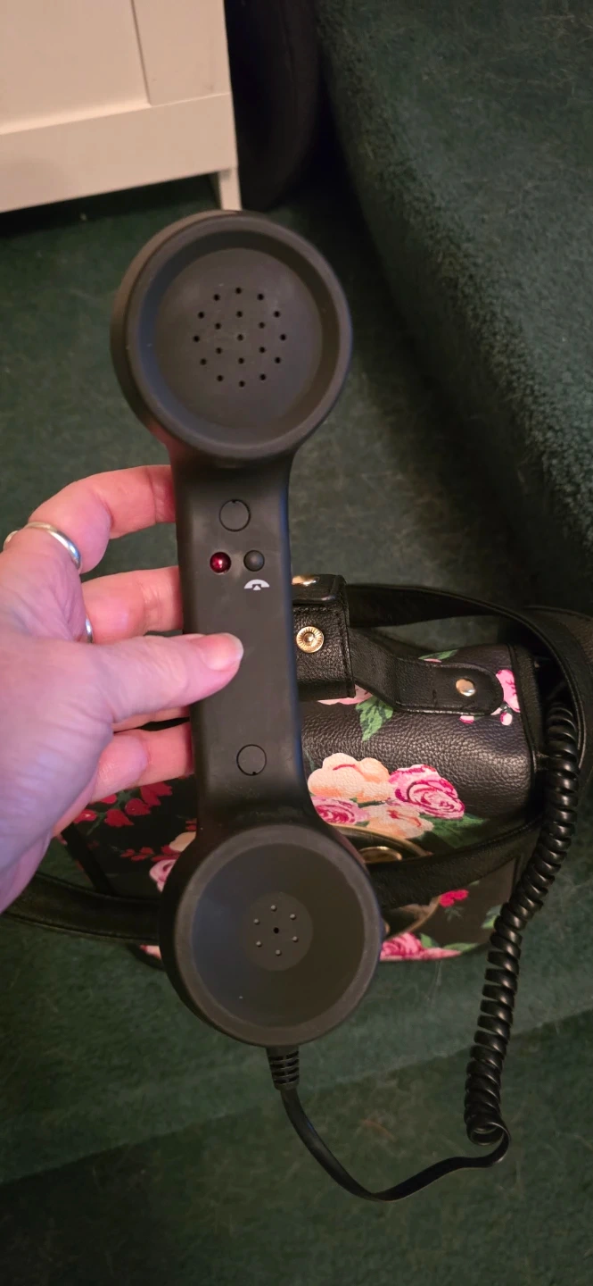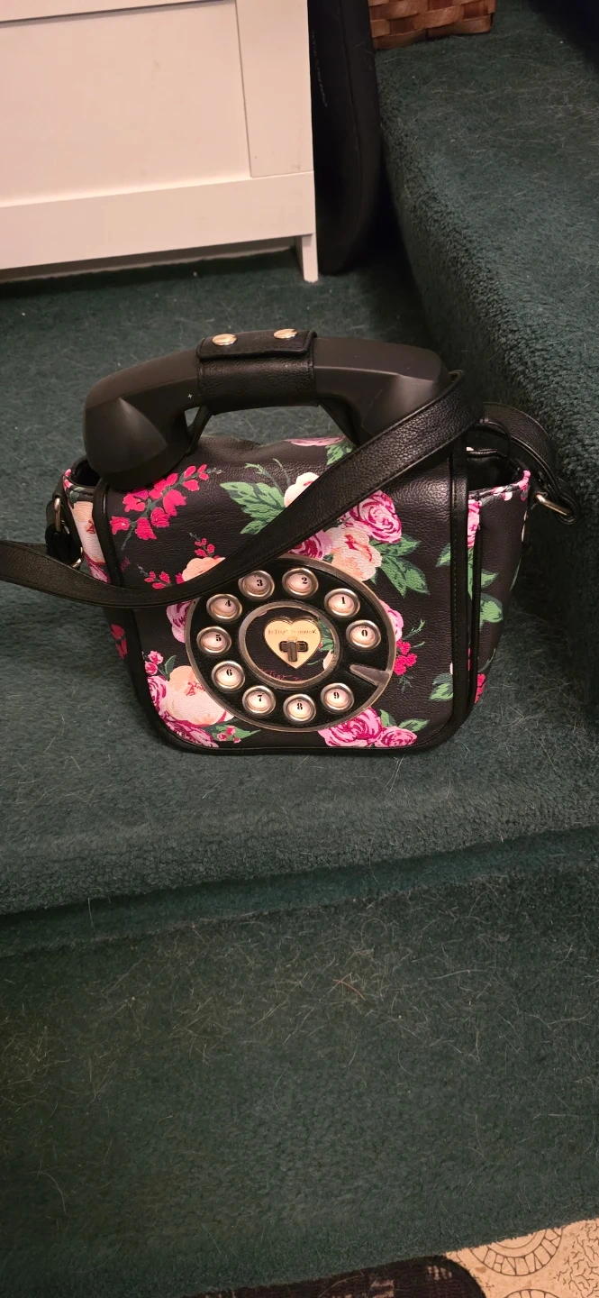 Betsey Johnson crossbody bag shaped like a rotary phone. It has a black background with a vibrant floral print. The bag features a detachable strap and a fun, unique design.