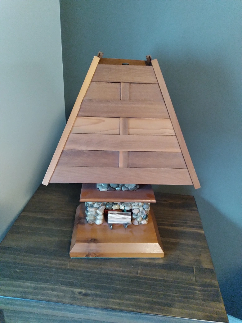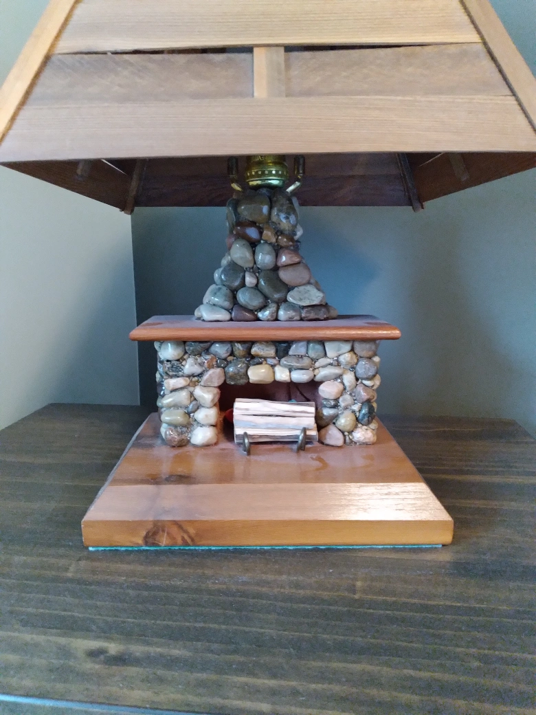 A unique and charming lamp with a stone fireplace design. A great conversation piece. The lamp features a wooden frame and shade. The fireplace is decorated with small stones and a log.Asking $60 pickup preferred 13005 140 Palisades Park Villa's