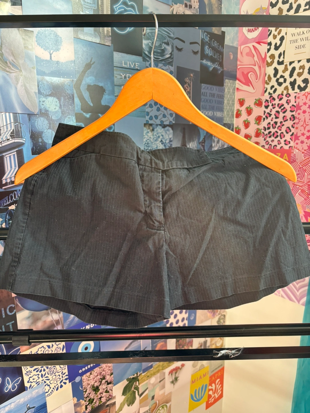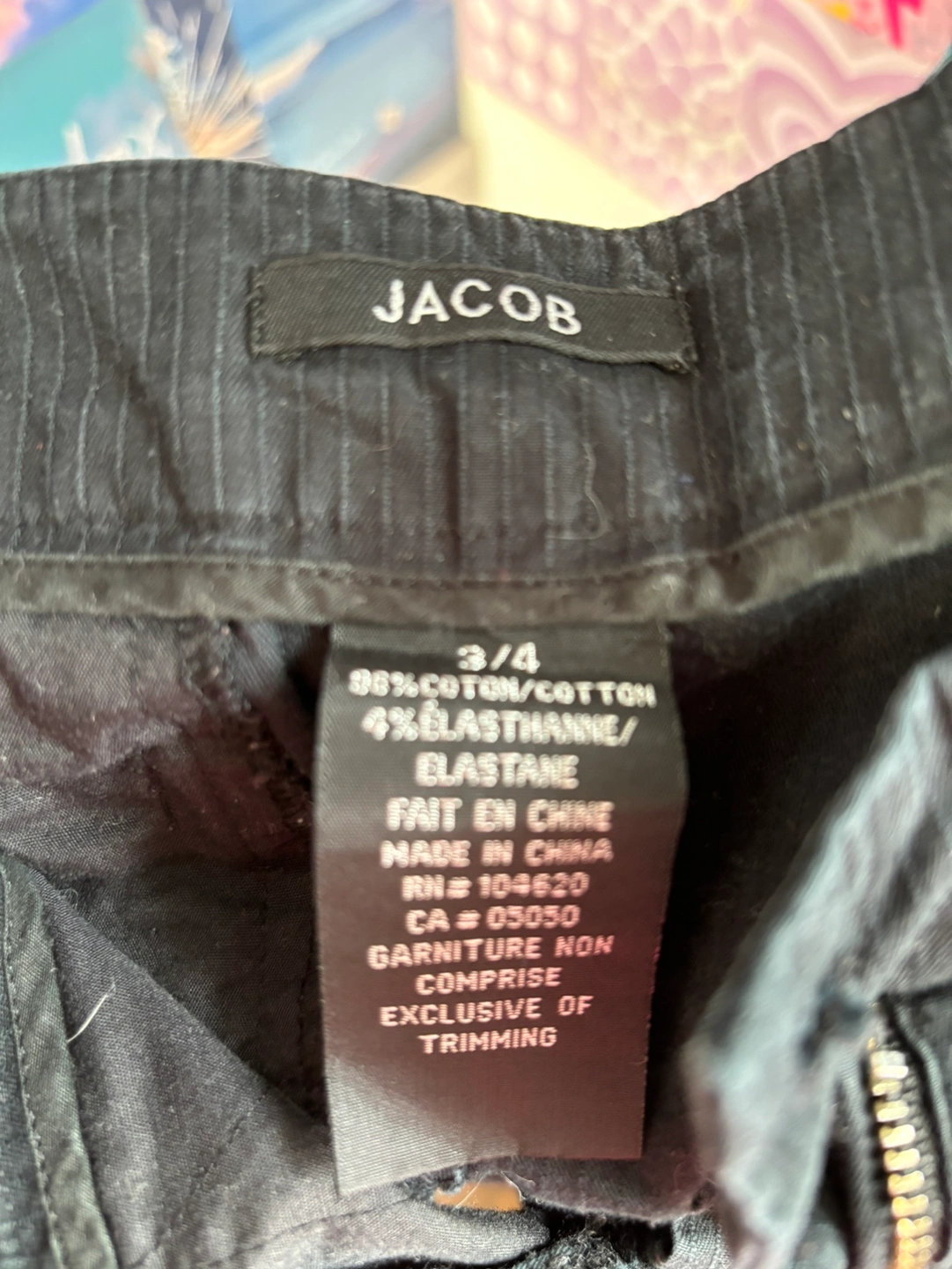 Black pinstripe shorts with a zip closure and button. Label states "Jacob" and "3/4". Made of 98% cotton and 4% elastane.