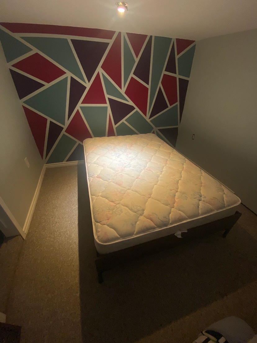 A double bed frame with a dark brown wooden frame and black metal legs. Comes with double matress- firm- no stains.