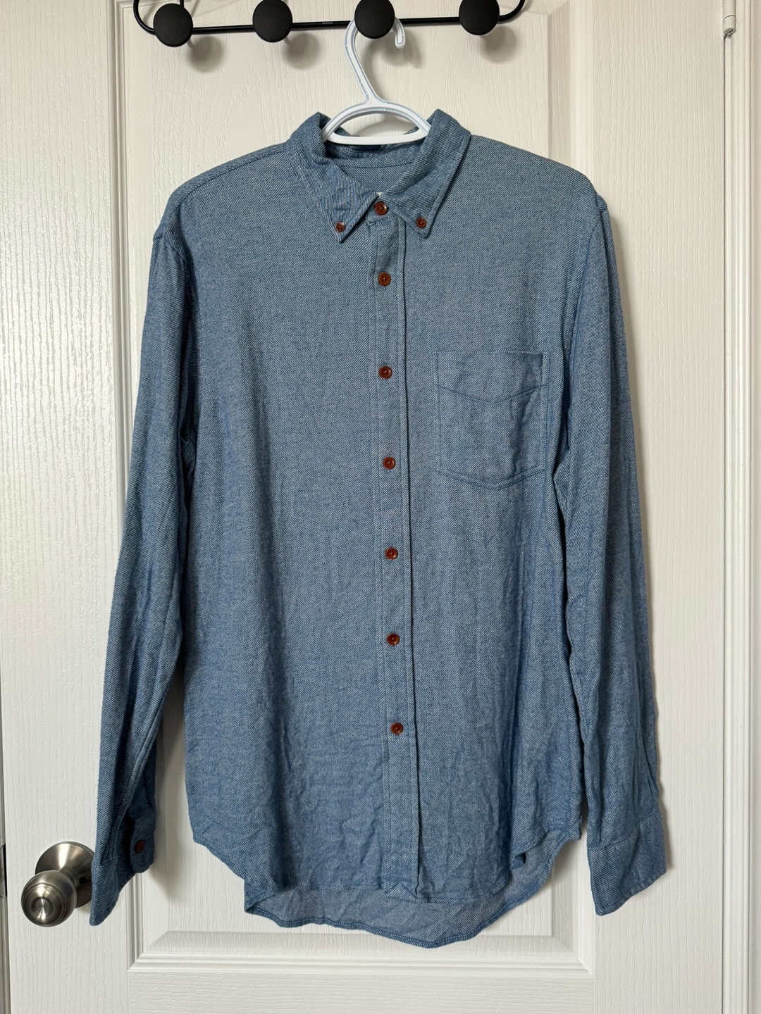140Pick up at 16th Ave & Kennedy, Markham Men's Club Monaco blue button up shirt. Size M/M. Long sleeves with a single chest pocket. The shirt has a slim fit. The buttons are a brown colour. ***Accept cash only