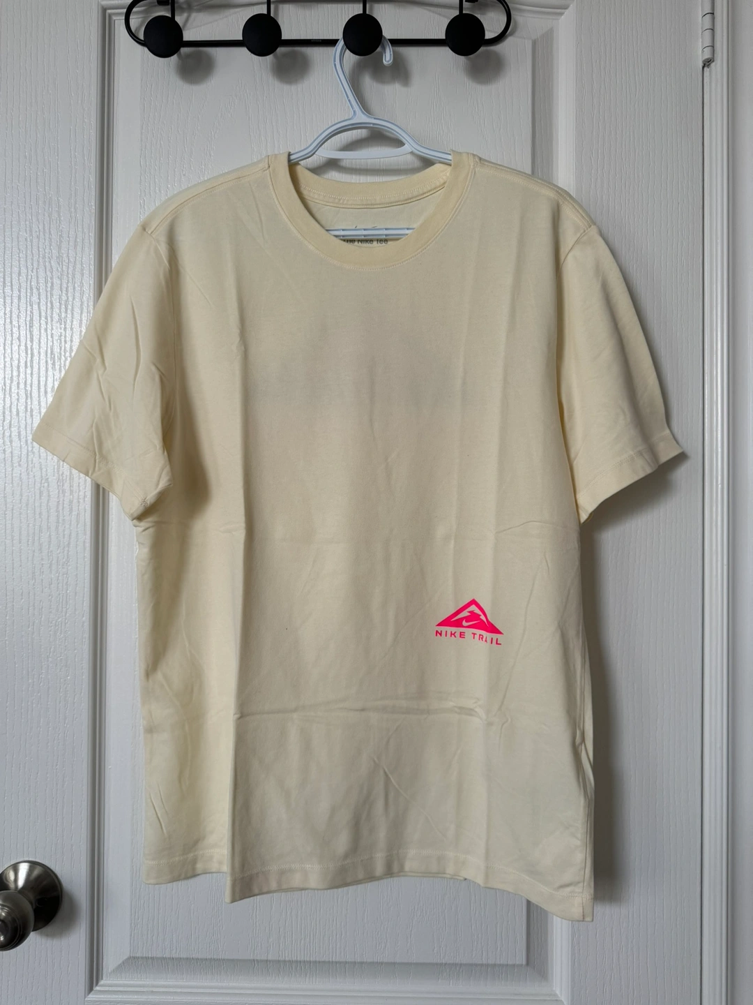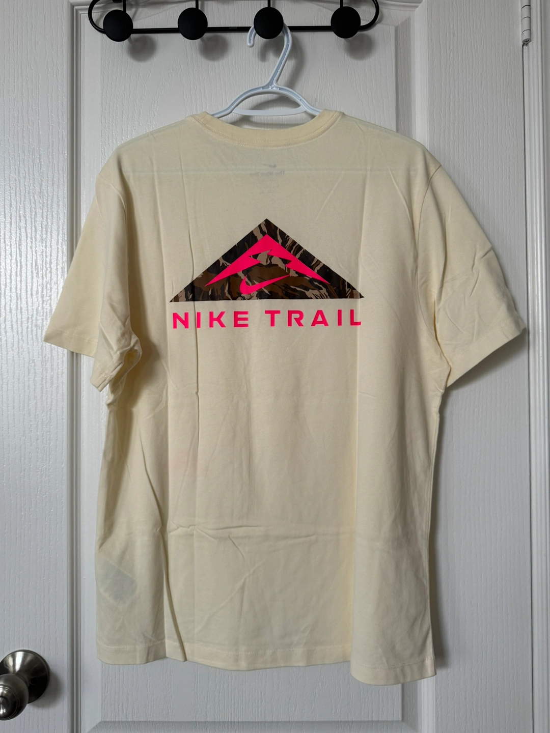 140Pick up at 16th Ave & Kennedy, Markham Men's Nike Trail T-shirt in a cream colour. It features a pink Nike Trail logo. The shirt has short sleeves. Size XL ***Accept cash only