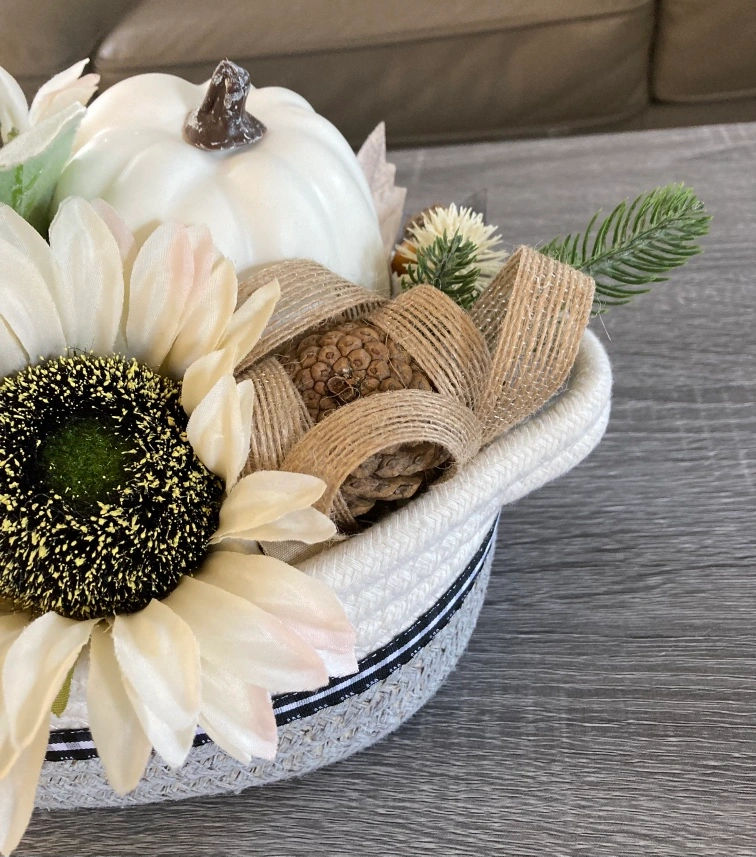 #10 Fall Table Centrepiece Approx. 6.5” tall by 11” wide by 6.5” deep Grey/creme woven basket with plaid trim holds artificial pumpkins, sunflowers, greenery, maple leaves, burlap ribbon, pine cones and acorns. Please follow the link below for more. Thanks. Facebook page: Artizanna https://www.facebook.com/profile.php?id=100073692274142 Or Instagram: @artizanna__