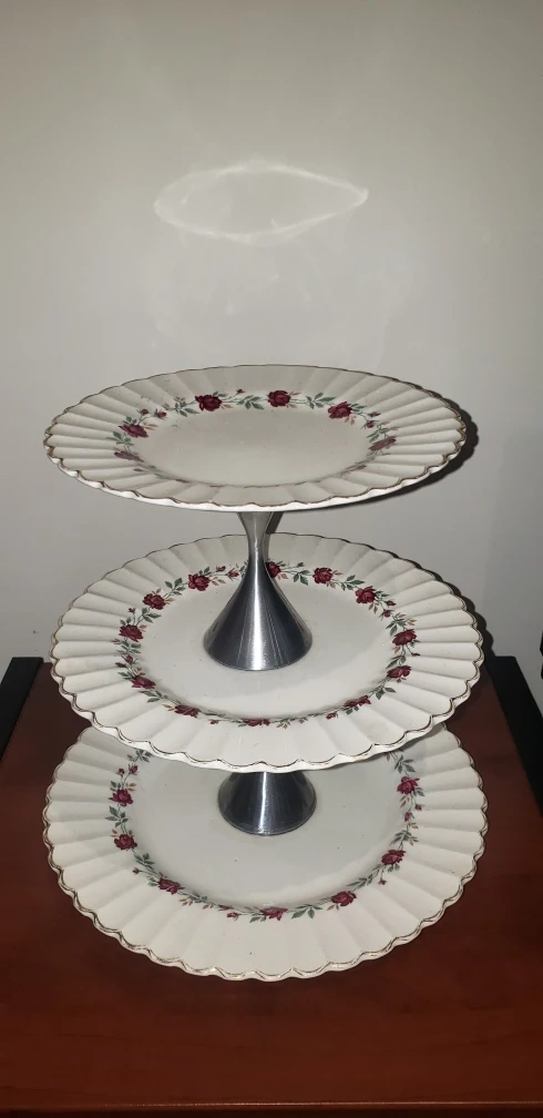 This is a handmade three-tiered serving stand. Candlestick separators affixed with food safe glue. Cute decor item, trinket holder or mini dessert stand.
