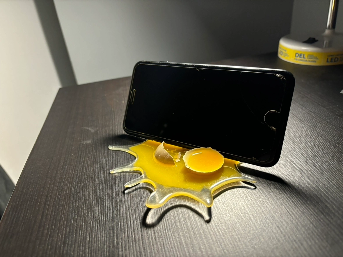 A fun and quirky phone stand in the shape of a cracked egg. Very useful to prank your friends and other people! Can also be used as a phone holder to make it even more fun to use! In this picture there is an iPhone 7 but it works in almost every kind of phone as phone holder !