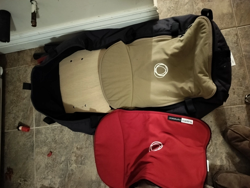 3. & 4. Bugaboo caméléon bassinet and 2 covers (beige or red). In picture 4, you will see that the wooden base is slightly cracked. Wouldn't affect use. Missing the mat that goes on top of it.