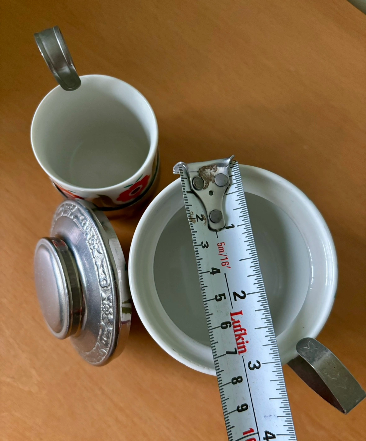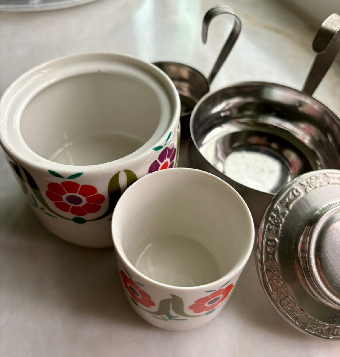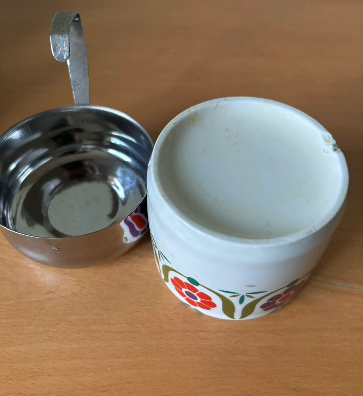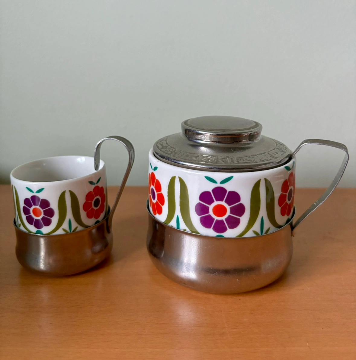 1000+This beautiful set includes one creamer and one sugar bowl. They are both porcelain with floral designs and have a removable stainless steel exterior and handle. The creamer has a stainless steel lid. Small imperfections on bottom of the creamer (not visible with the stainless steel exterior) and on the stainless steel (a tiny hole visible in last pic) - Price to sell! Click on my name above and scroll down to see my other listings and pickup locations.