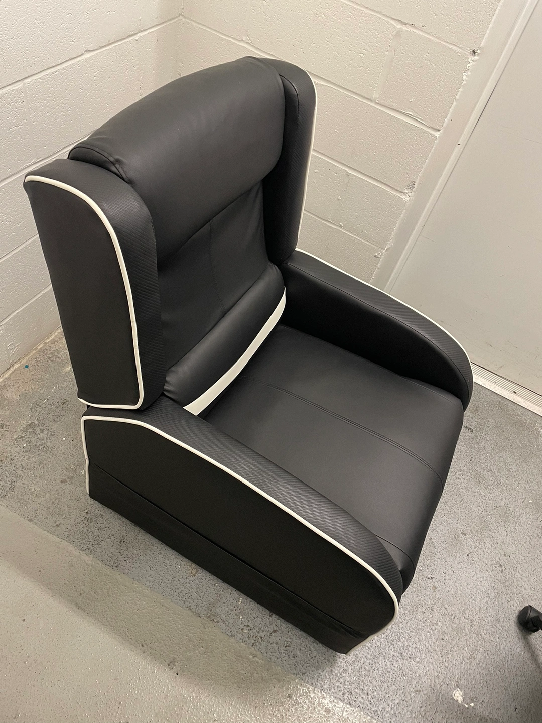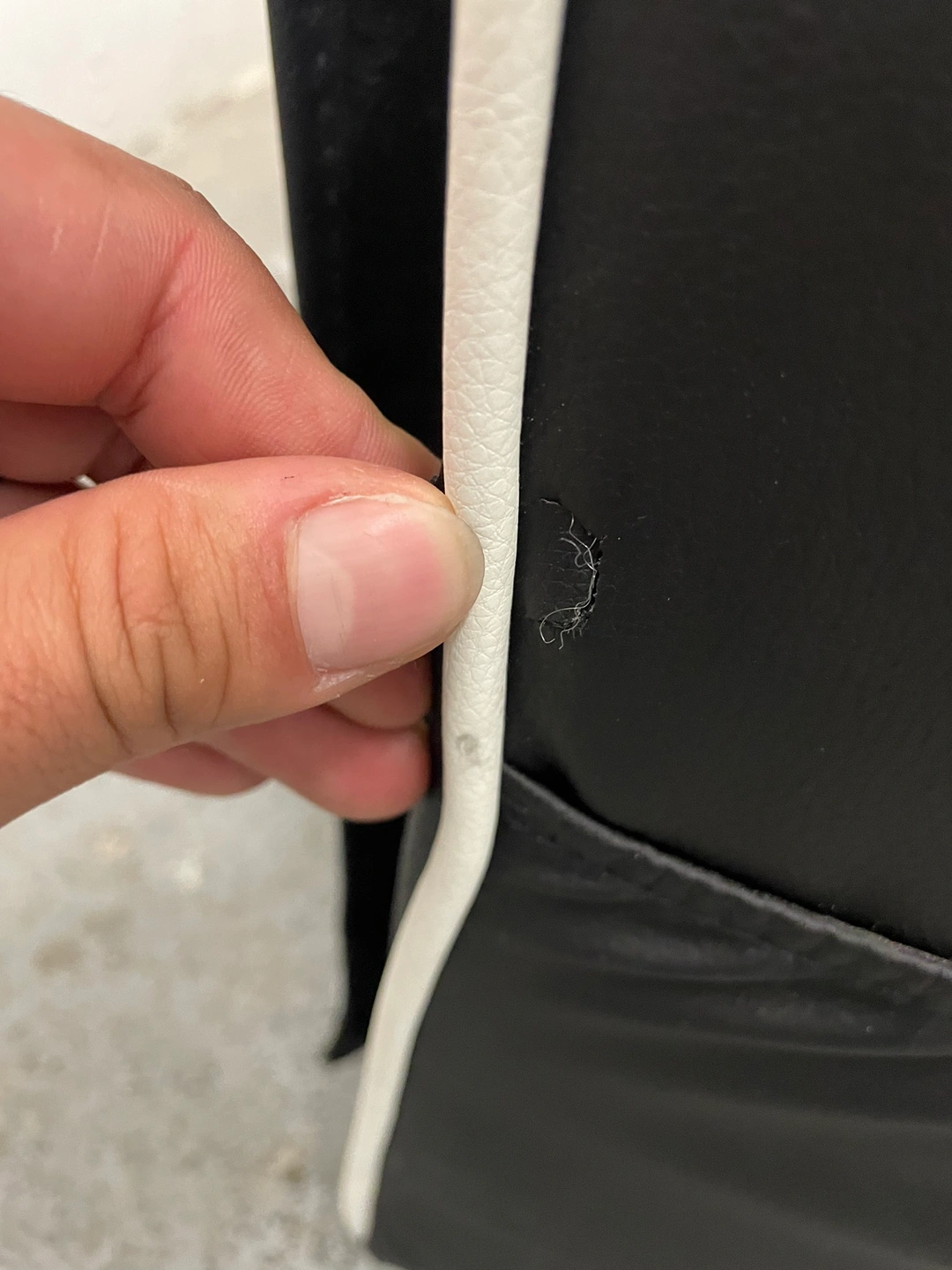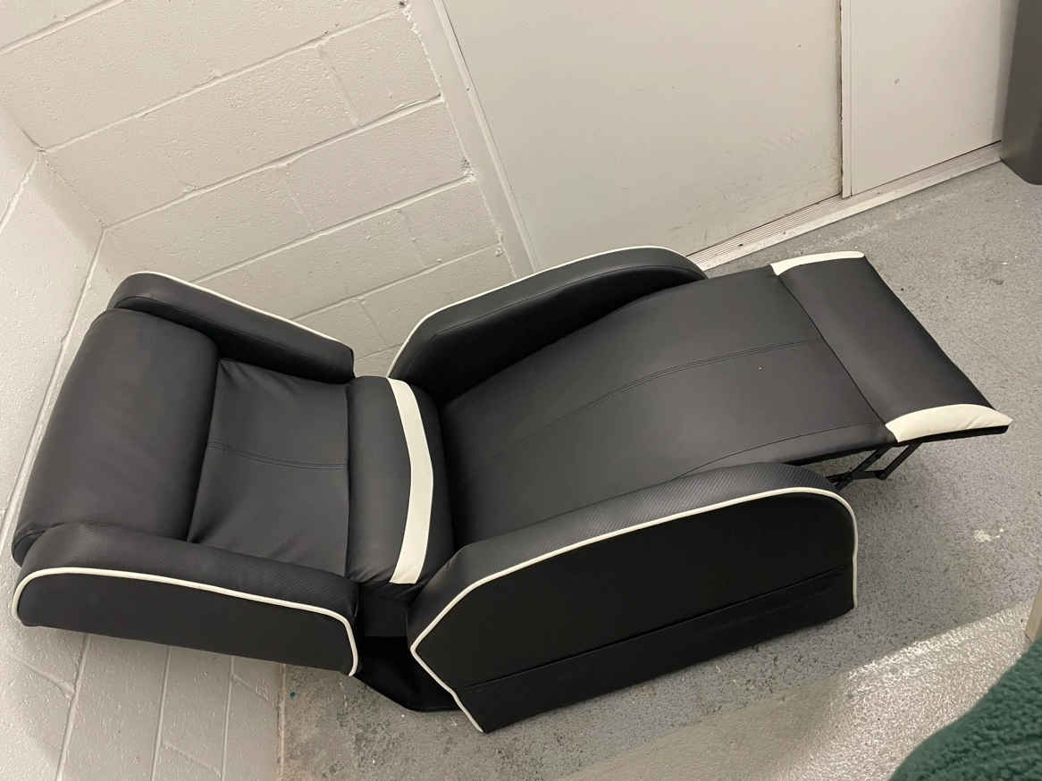 This is a black and white recliner with white piping. The recliner is in good condition just a minor tear smaller than my nail. It is a manual recliner.