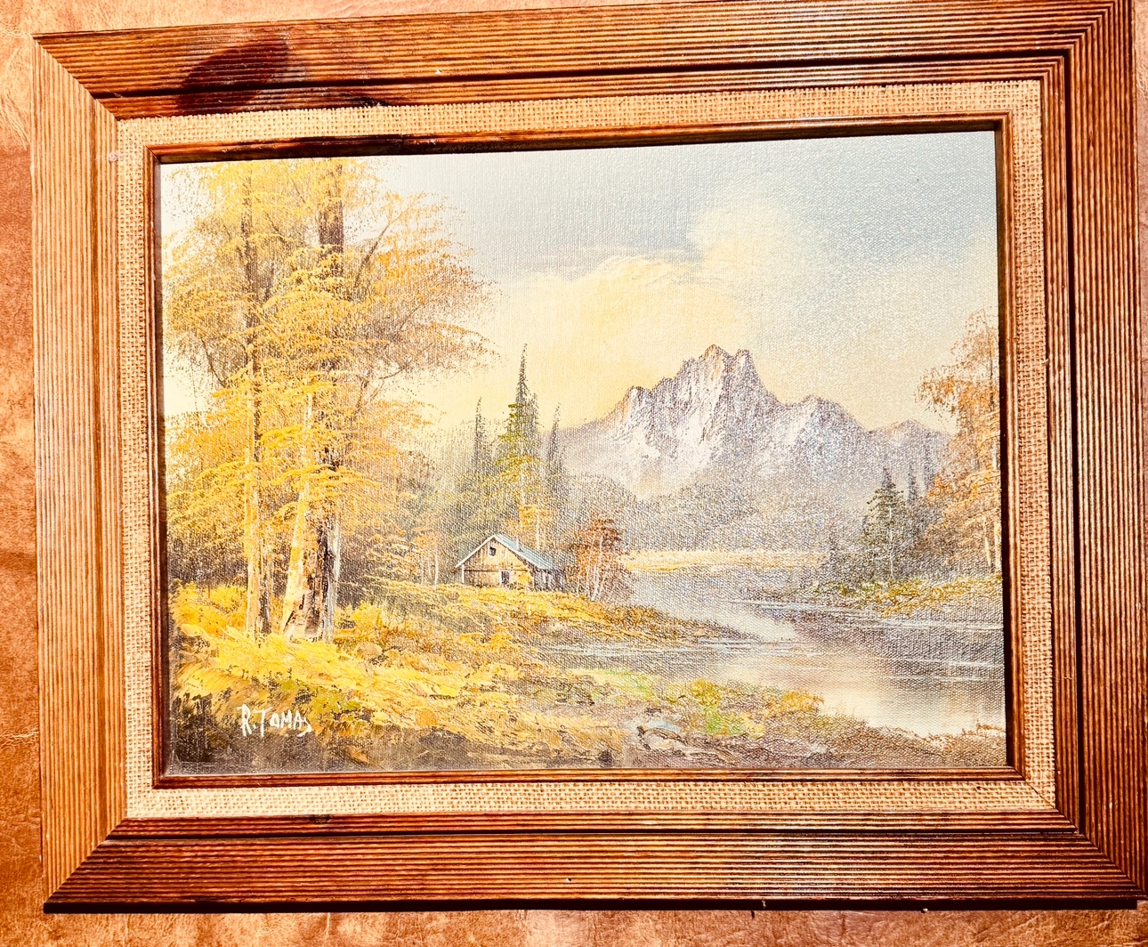 18Oil painting by R.Tomas of A cabin by the mountain…. 201/2”w x161/2”h Cash and carry…. No Returns