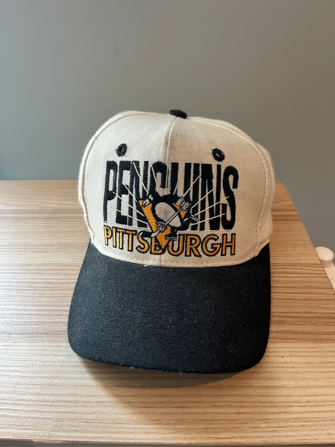 Vintage Pittsburgh Penguins hat with black and white colour scheme and an embroidered logo on the front.
