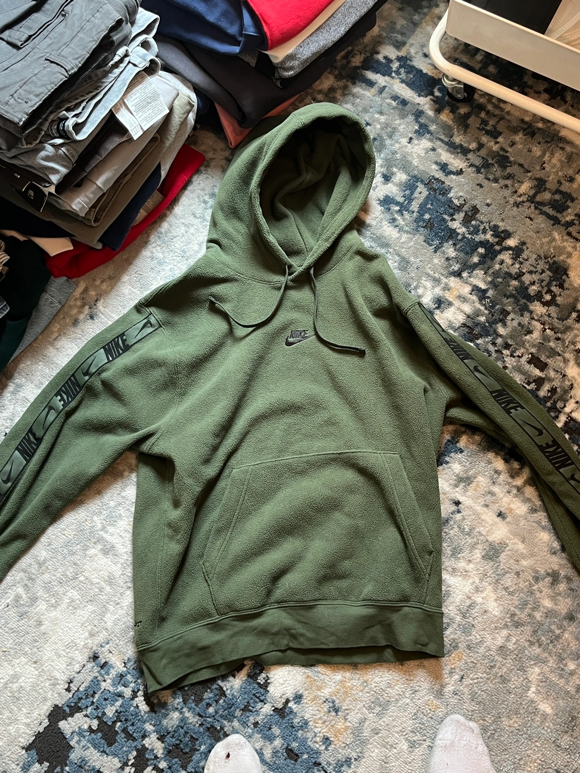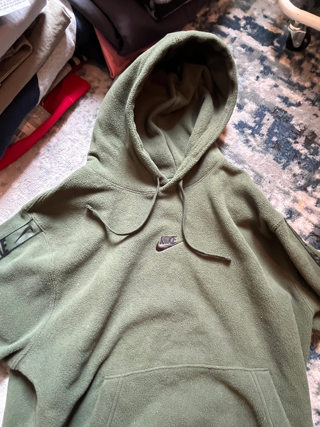 Green Nike Therma-Fit fleece hoodie with black Nike logos and side arm stripes. Size Medium Pick up only near Main St & Kingston Rd (apartment). If you’re interested, let me know what day and time you can come. Please don’t ask if it’s available — if the listing is up, it’s still available.