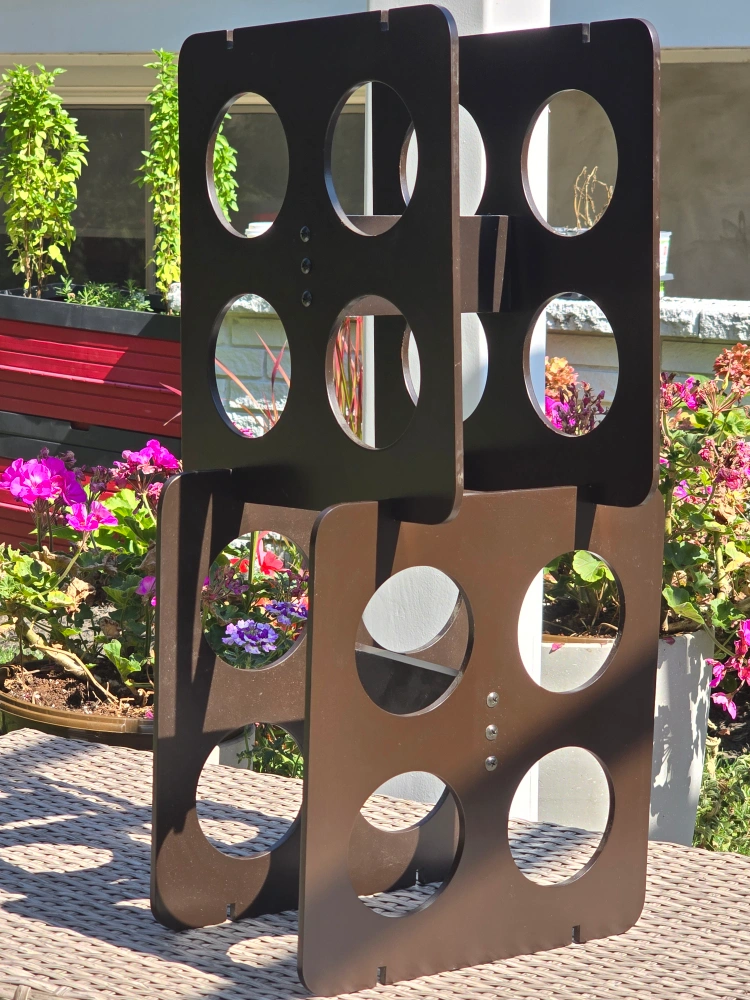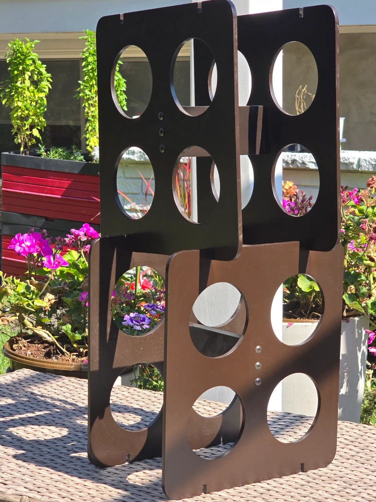 A wine rack that can be assembled into a tower or used as separate pieces. It can hold 8 bottles of wine.