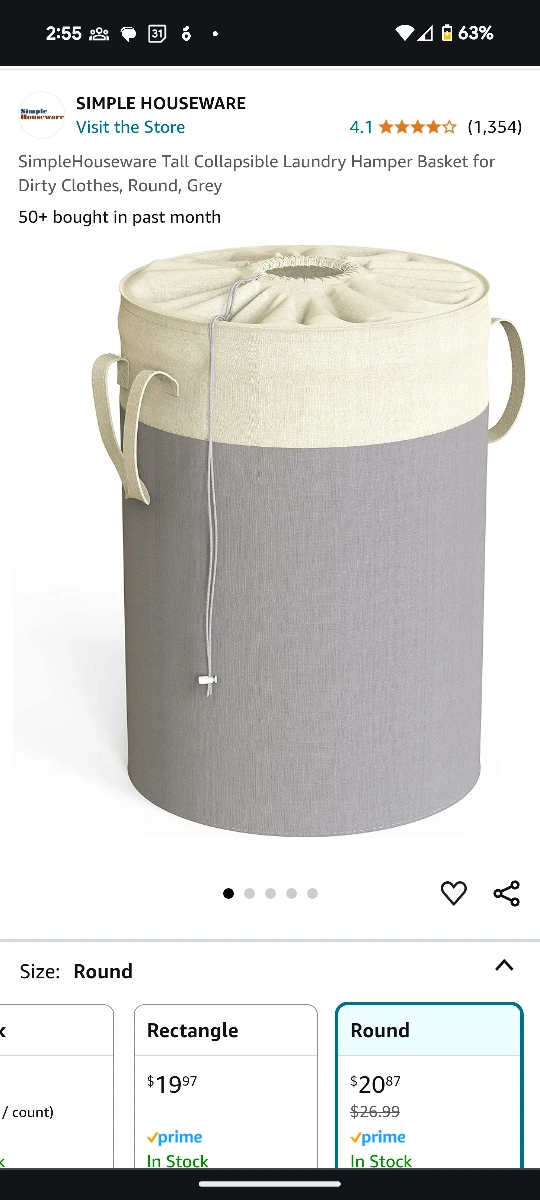 Round Collapsible Laundry Hamper Basket in grey with a beige top. It has two handles and a drawstring to close.