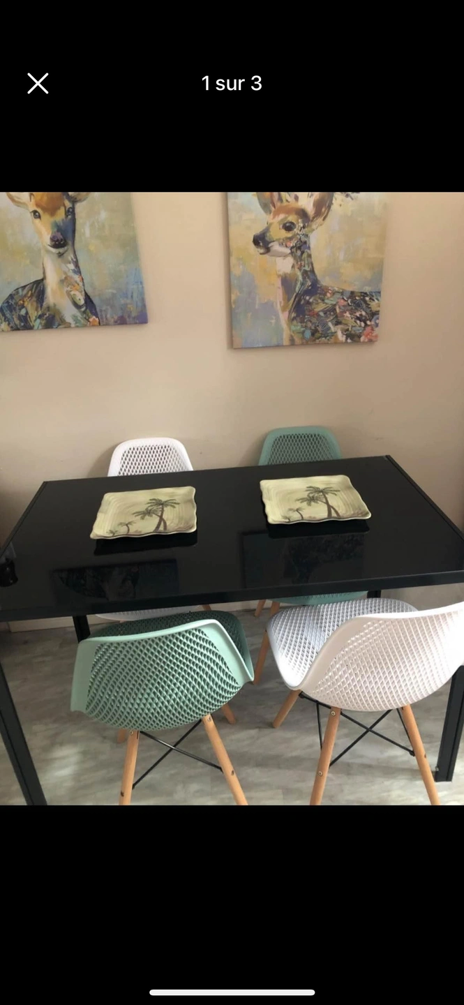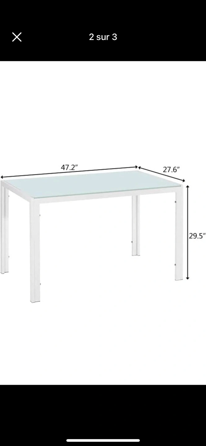 Table measures 47.2" wide x 27.6" deep x 29.5" high. It has a black glass tabletop and a black metal frame. The table is in great condition with minimal signs of wear and tear. It is a perfect addition to any kitchen or dining room.