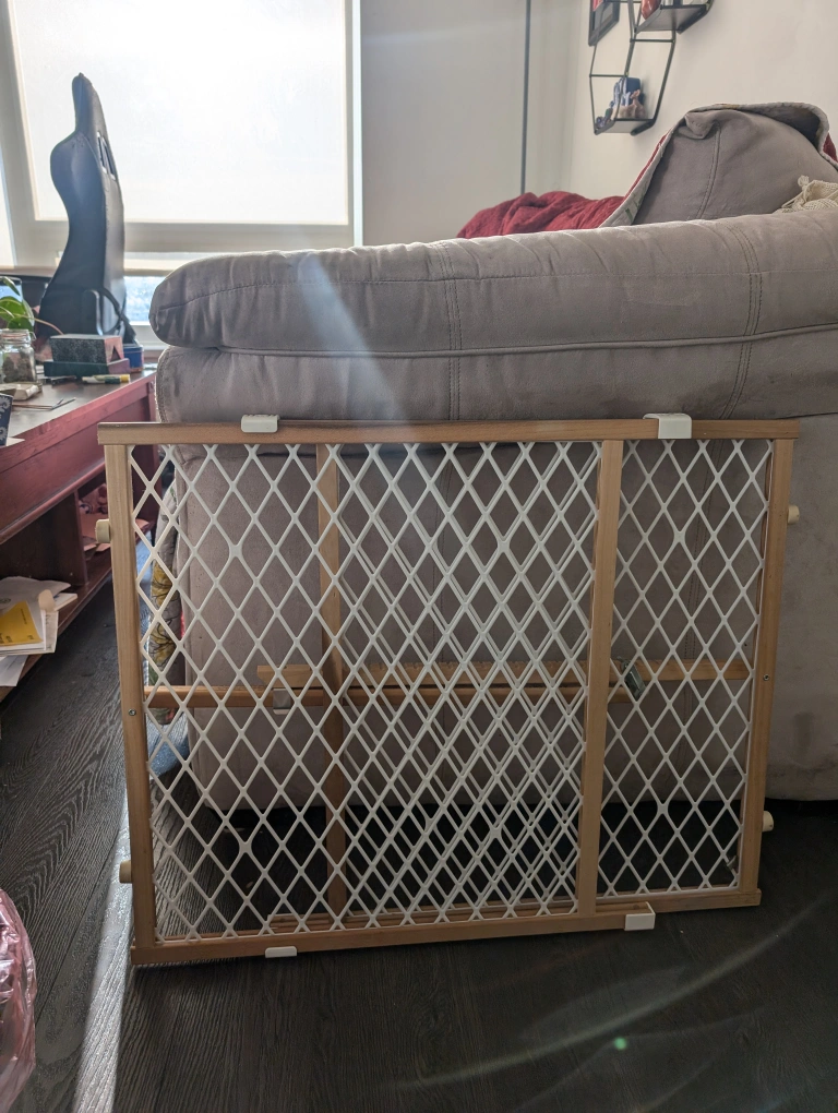491Wooden baby gate with white mesh. Can be adjusted in width. Works great, just no need for it anymore. Pick up only.