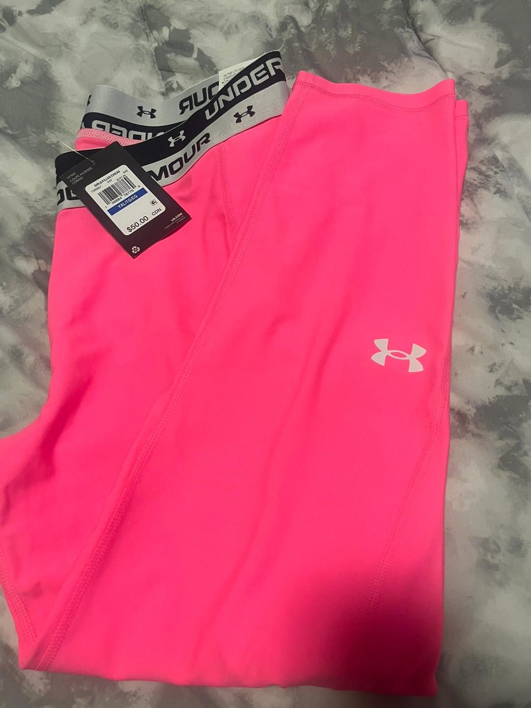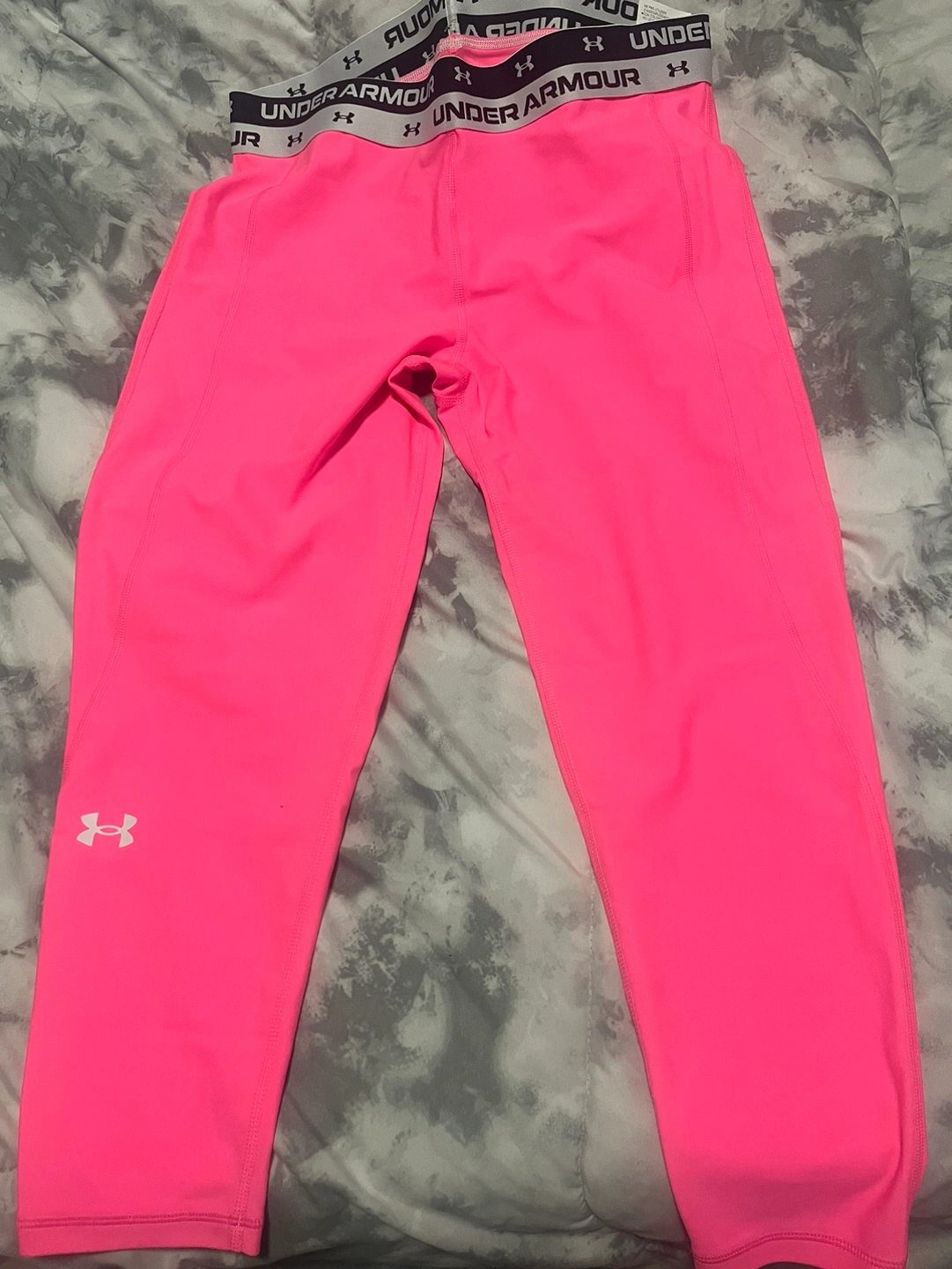 Pink Under Armour leggings with a white logo. They have a high waist. They are in great condition. They are a size youth extra Large. They are cropped. They are made of a stretchy, breathable material.
