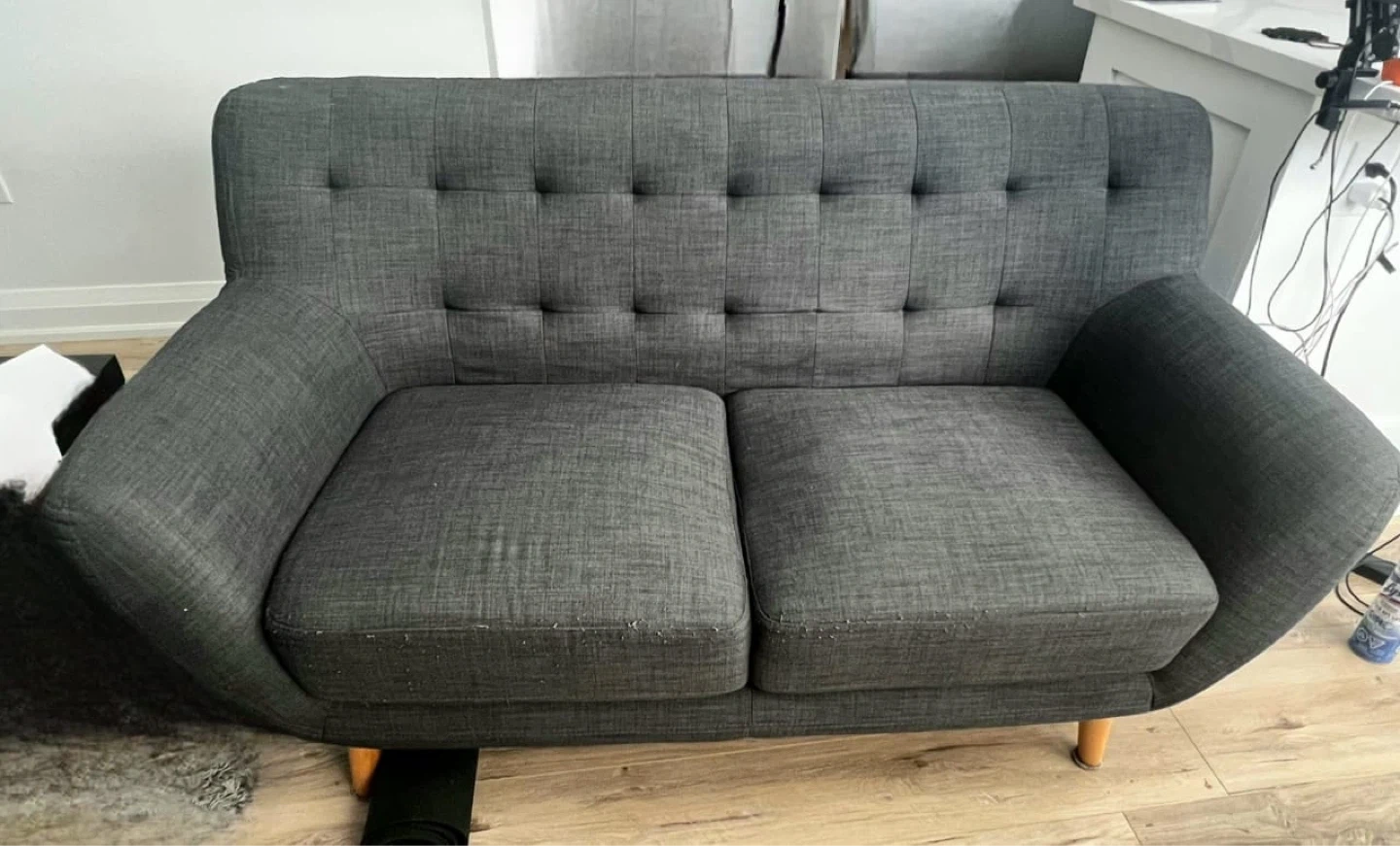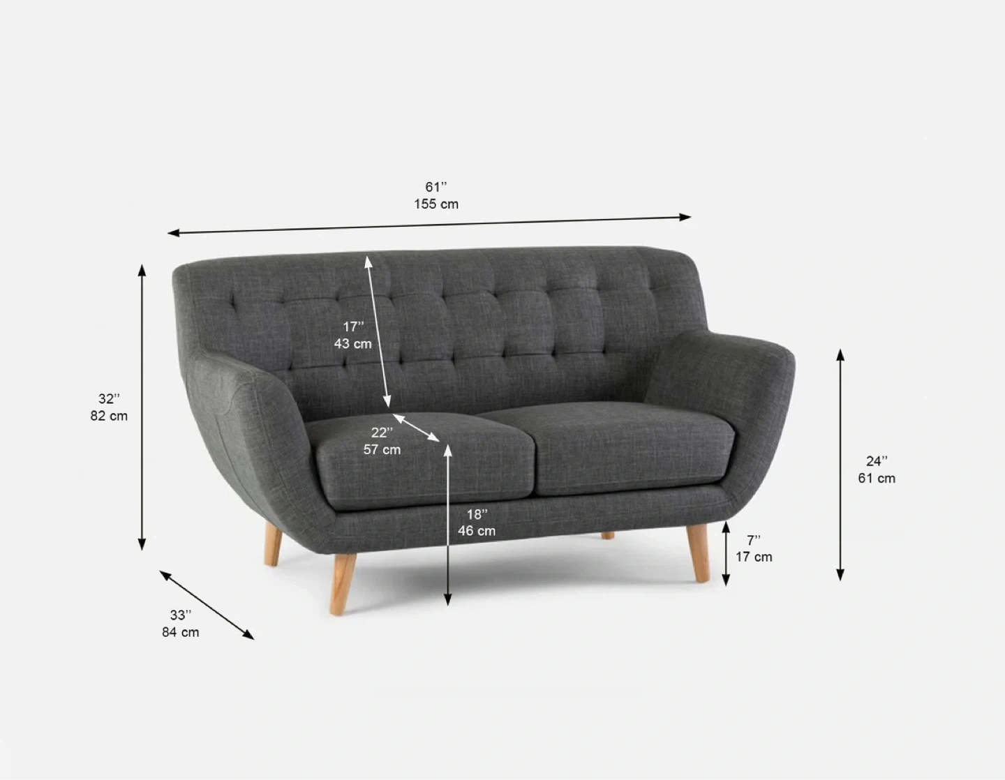 This is a two-seater sofa upholstered in a dark grey fabric. It features a tufted backrest and tapered wooden legs. Overall dimensions are 61" W x 33" D x 32" H. Seat depth is 22" and seat height is 18".