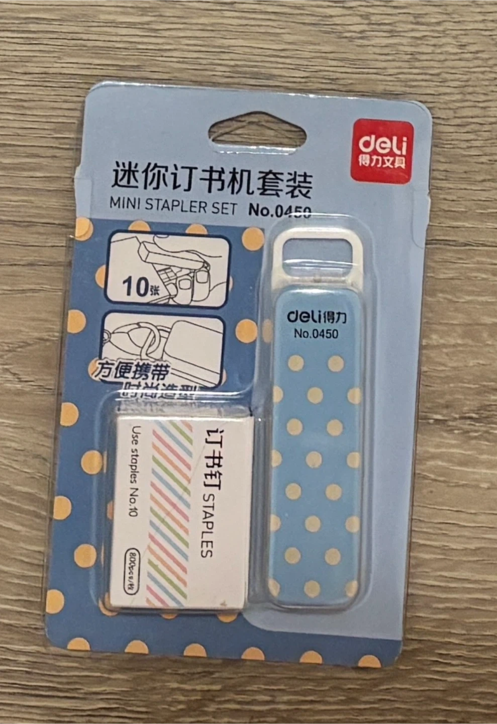 It's a cute little set with a blue stapler covered in polka dots and a box of staples.