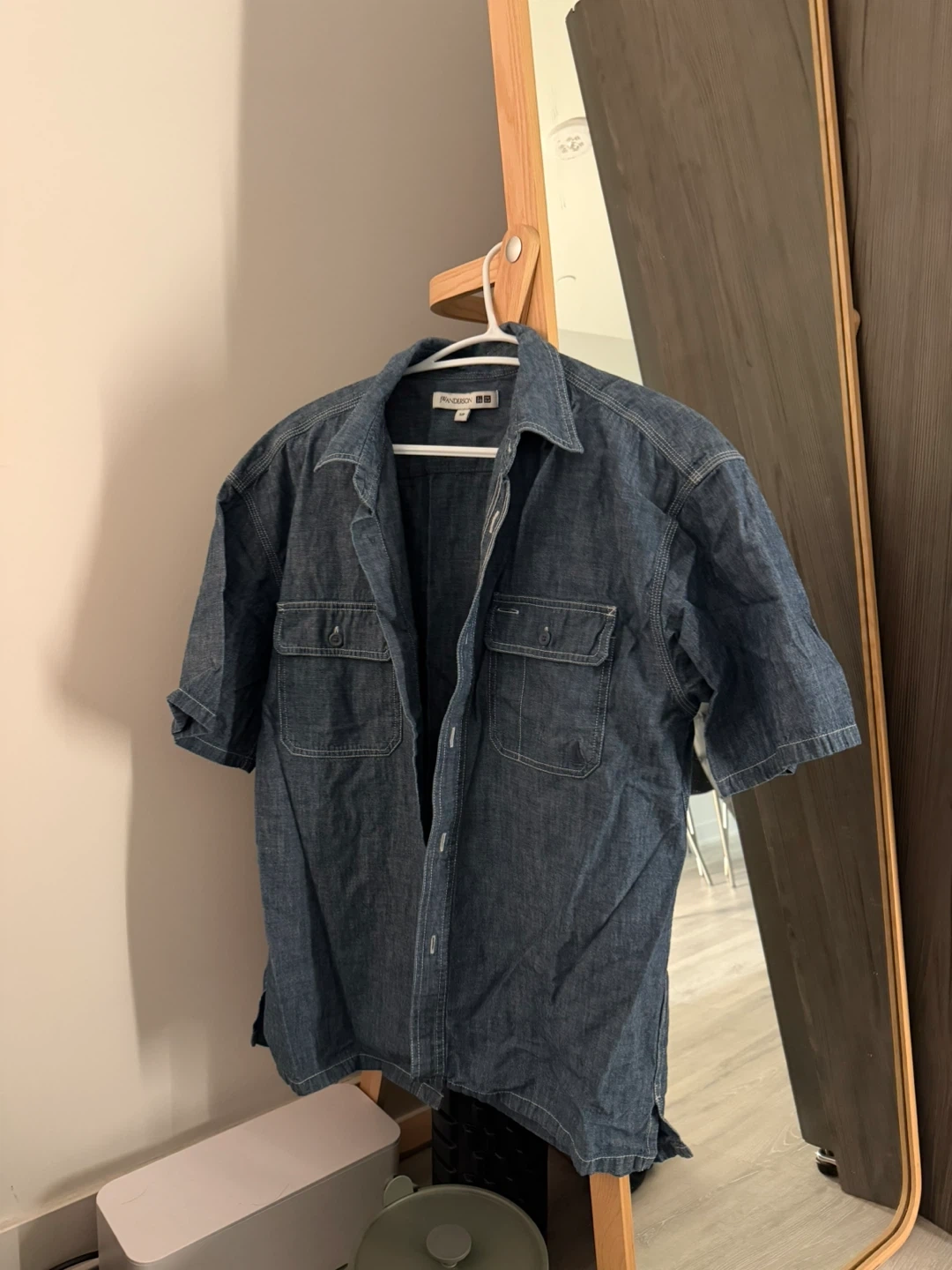 Short-sleeve denim shirt from Uniqlo's collaboration with JW Anderson. It's a blue wash with two chest pockets. This shirt is a size medium.