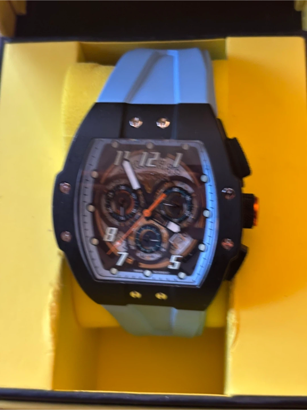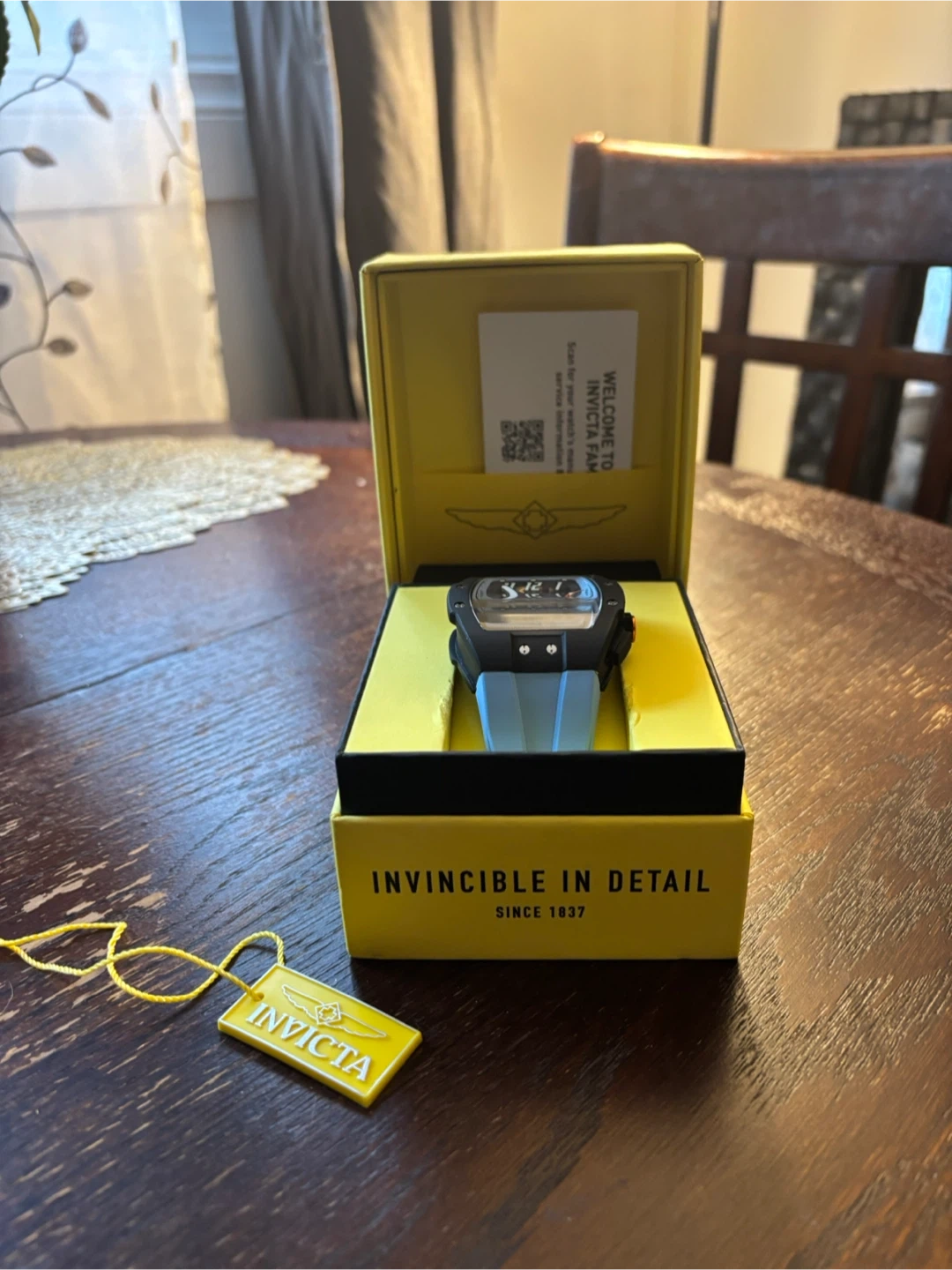 Invicta chronograph watch in original box. Yellow case with a light blue silicone strap. Includes welcome card and tag. Swiss movement.