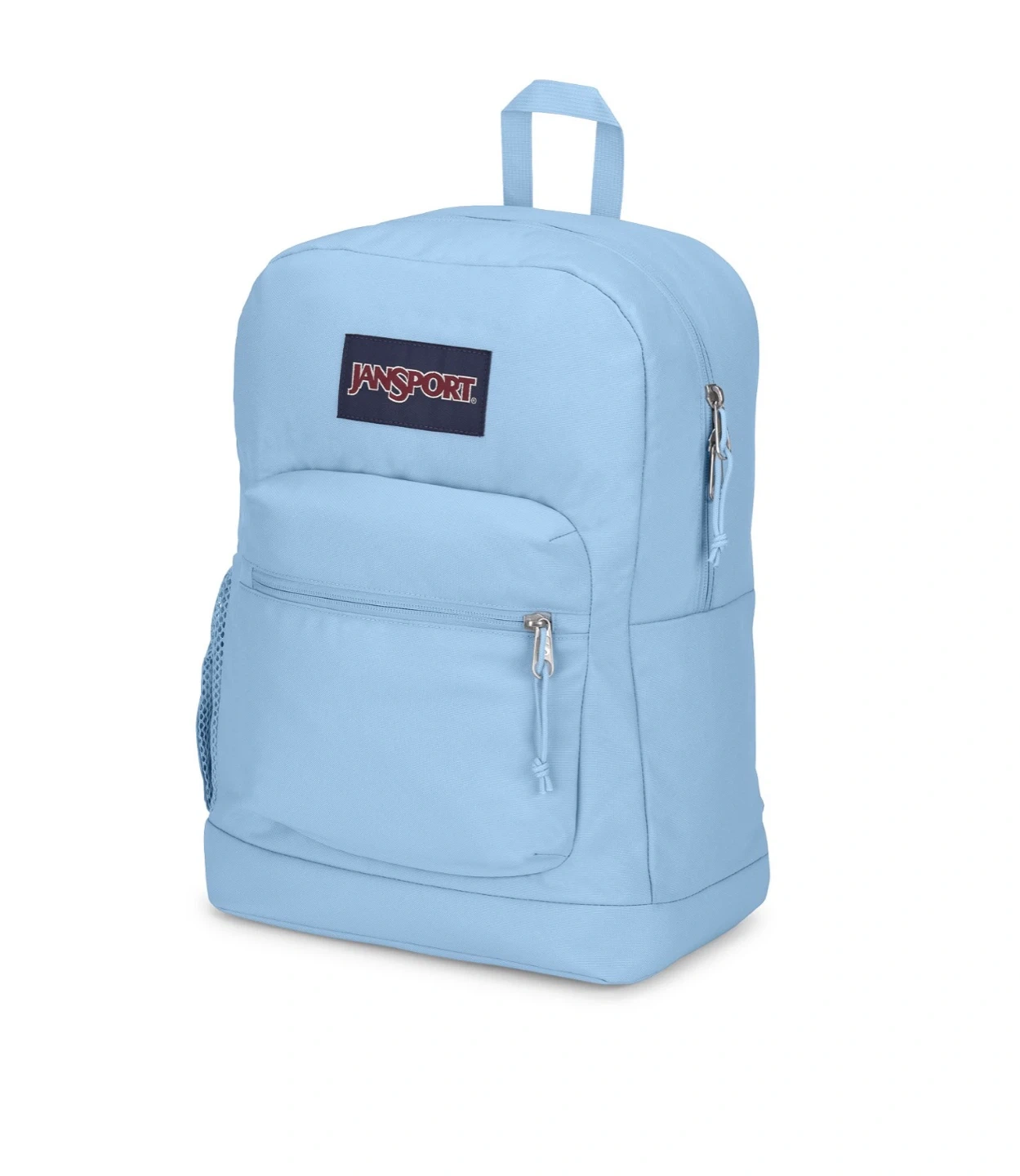 This Jansport backpack is a light blue color. It has a main compartment with a laptop sleeve and a front zippered pocket. There's also a side water bottle pocket. It's a durable option for everyday use!