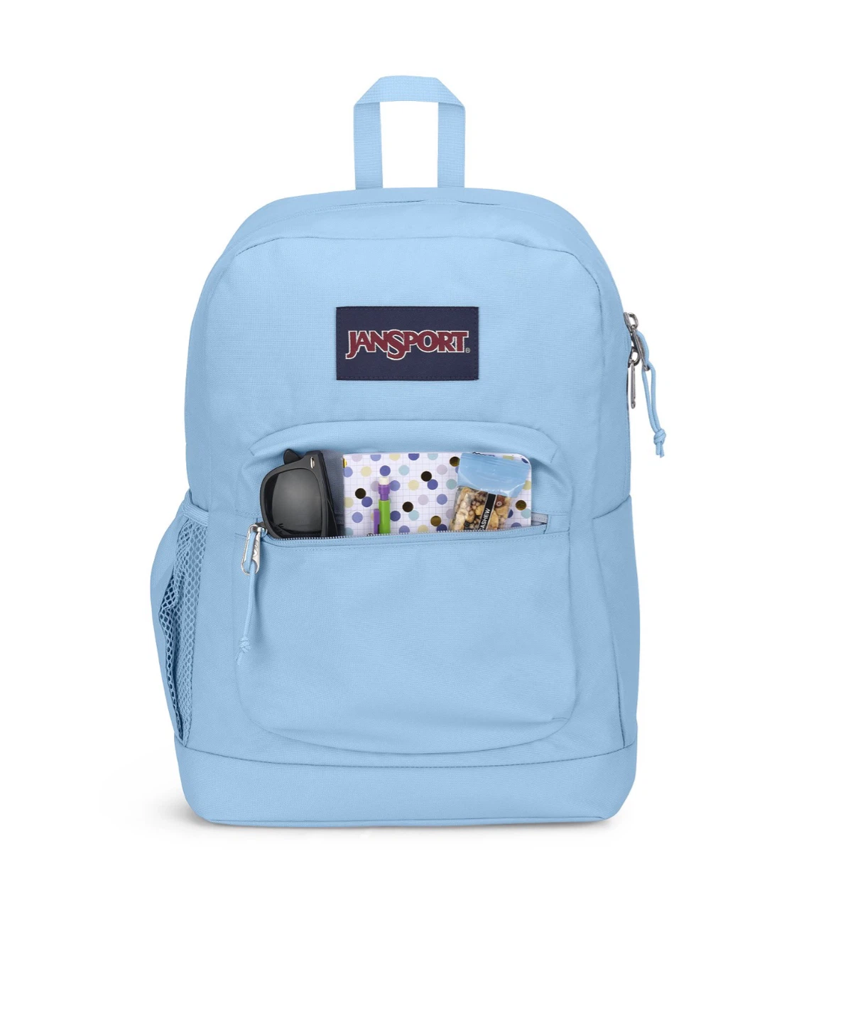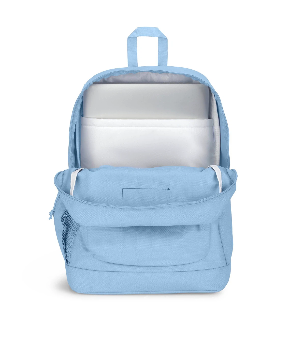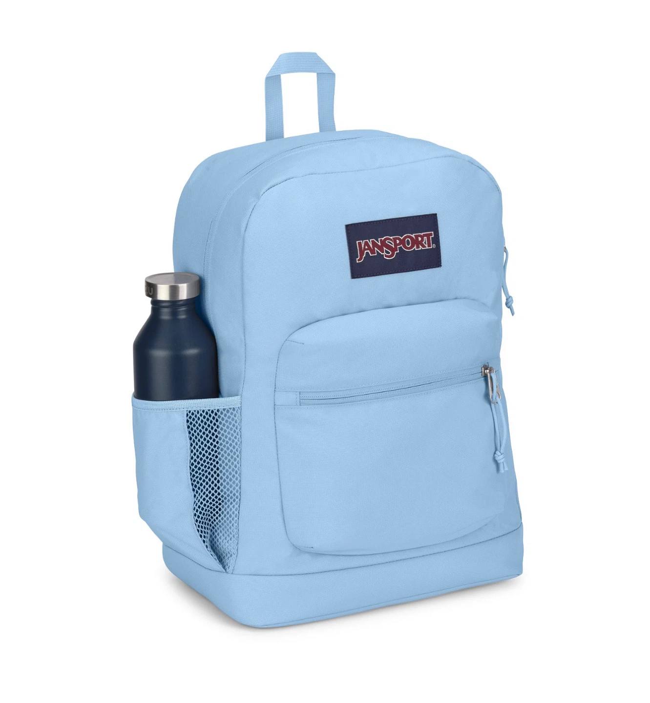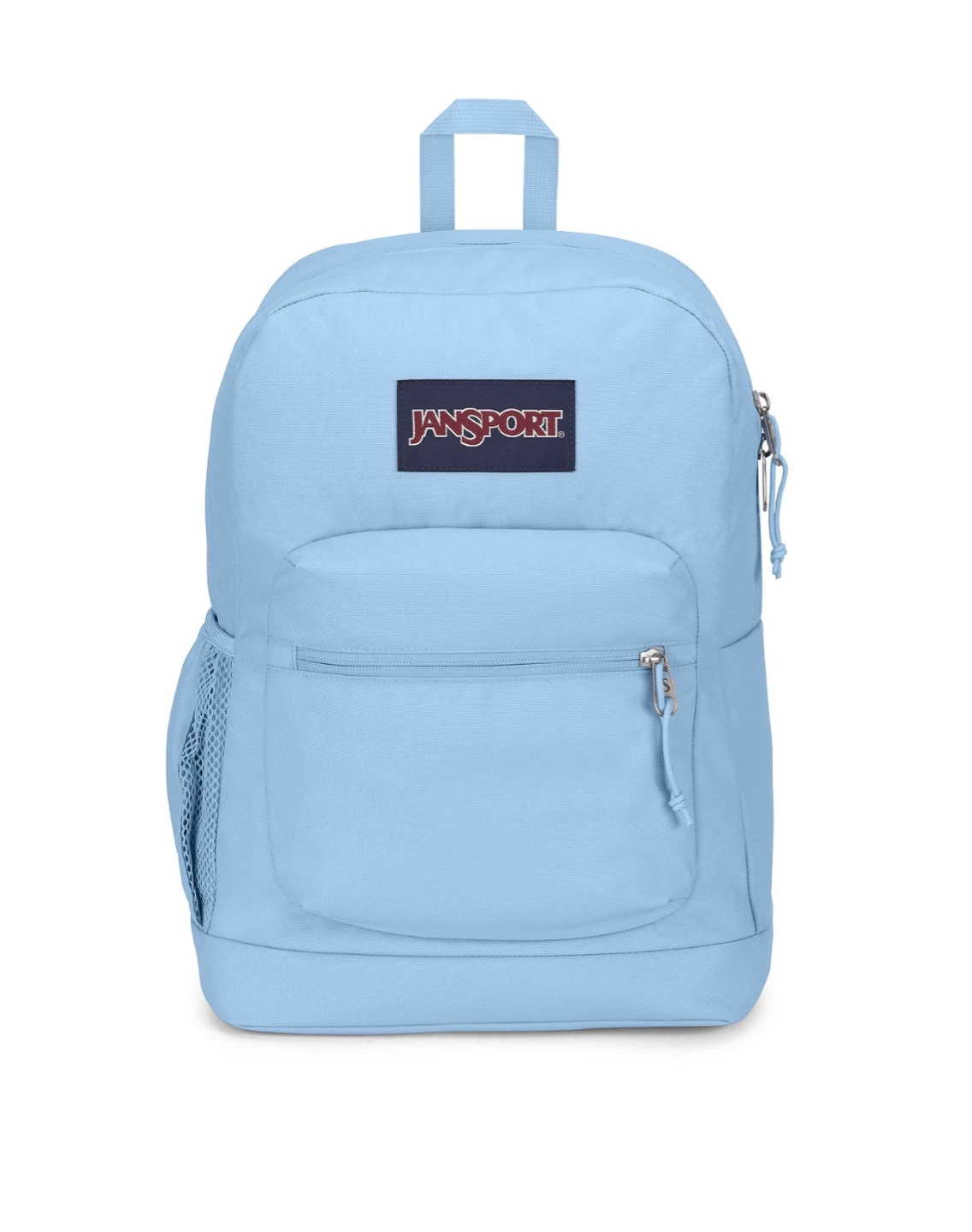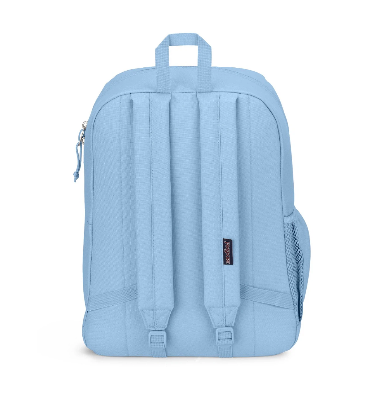 This Jansport backpack is a light blue color. It has a main compartment with a laptop sleeve and a front zippered pocket. There's also a side water bottle pocket. It's a durable option for everyday use!