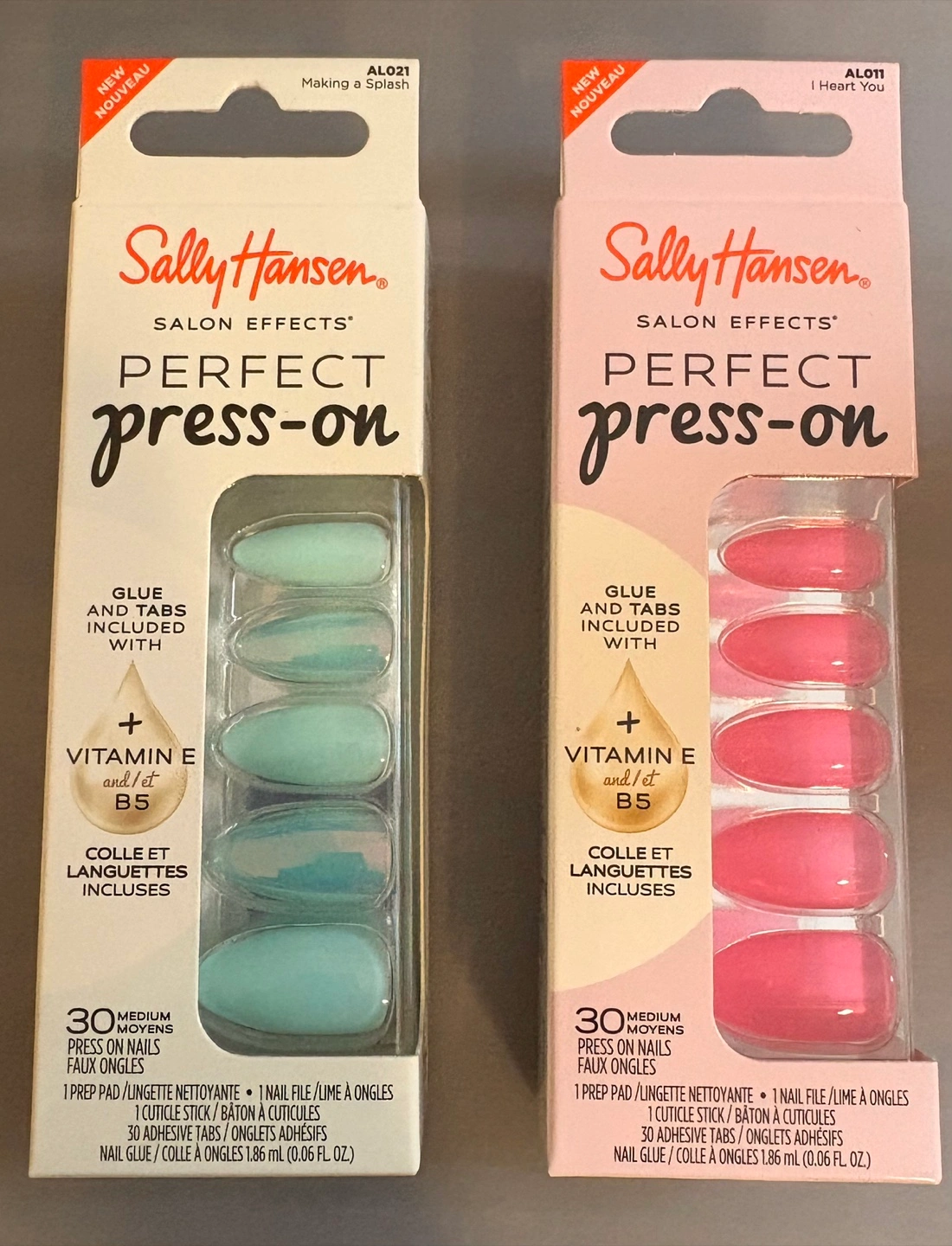 $10 Each - Two packs of Sally Hansen Salon Effects Perfect Press-On nails - Includes glue and tabs. Medium length. One pack is a light teal colour, the other is a light pink colour.