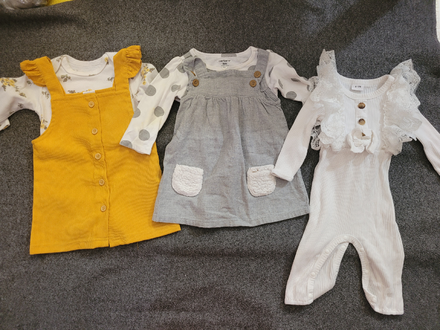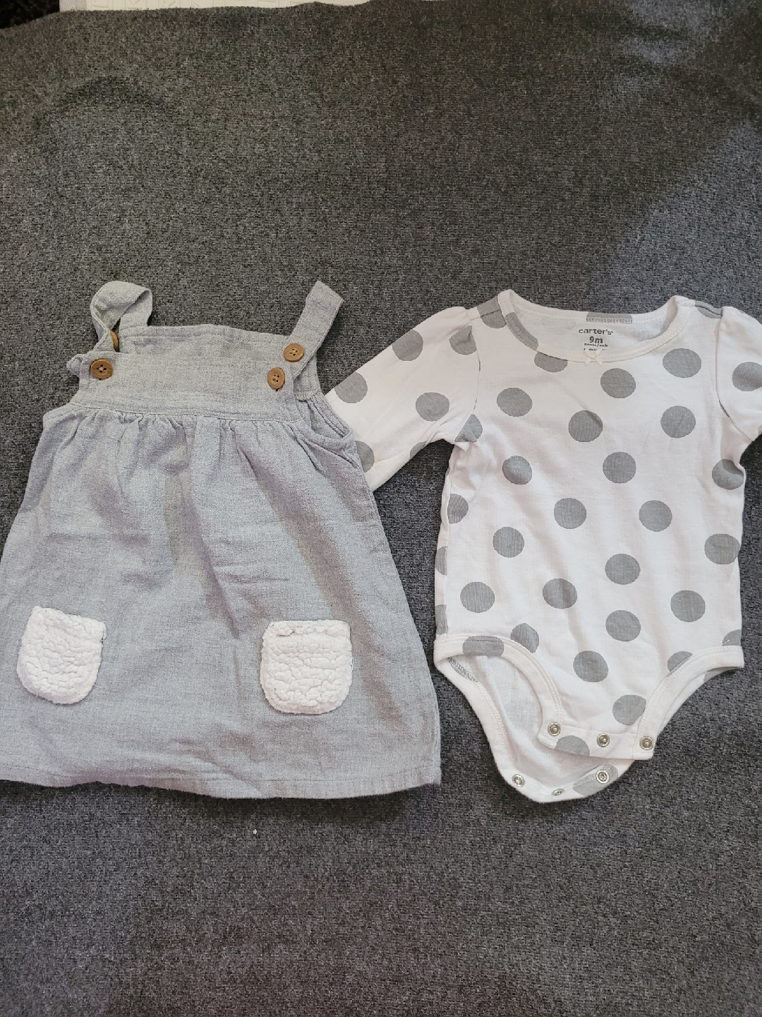 Selling a bundle of adorable baby clothes, perfect for your little one! Includes onesies and dresses in sizes 6-9M. Great condition and ready for a new home!