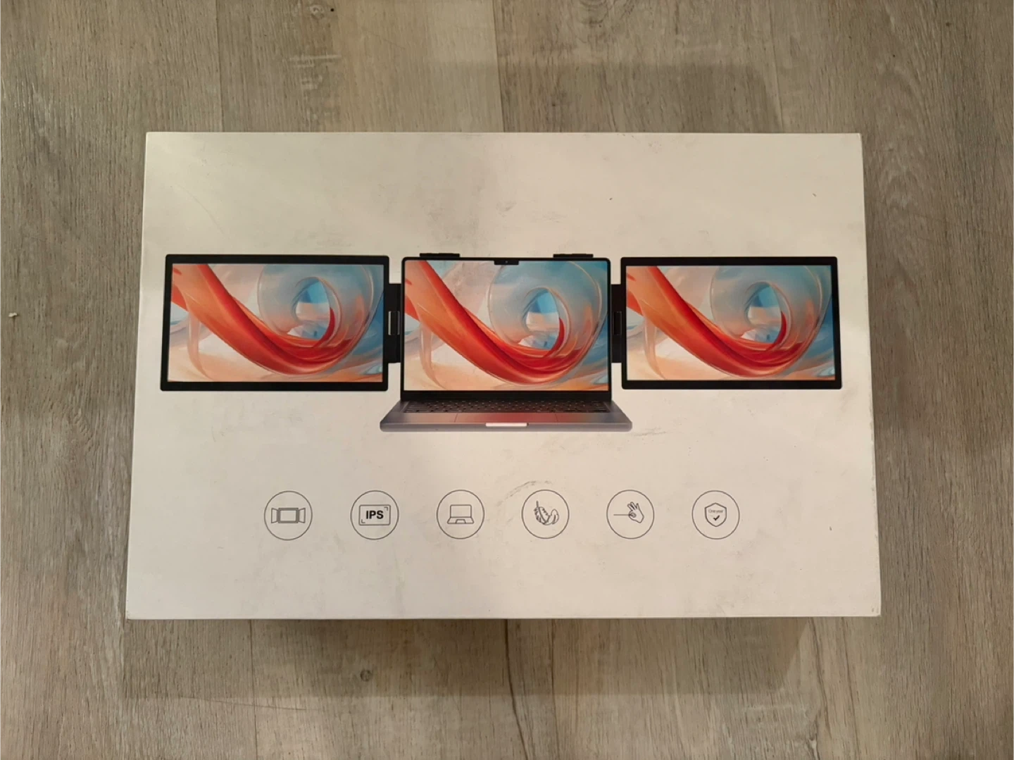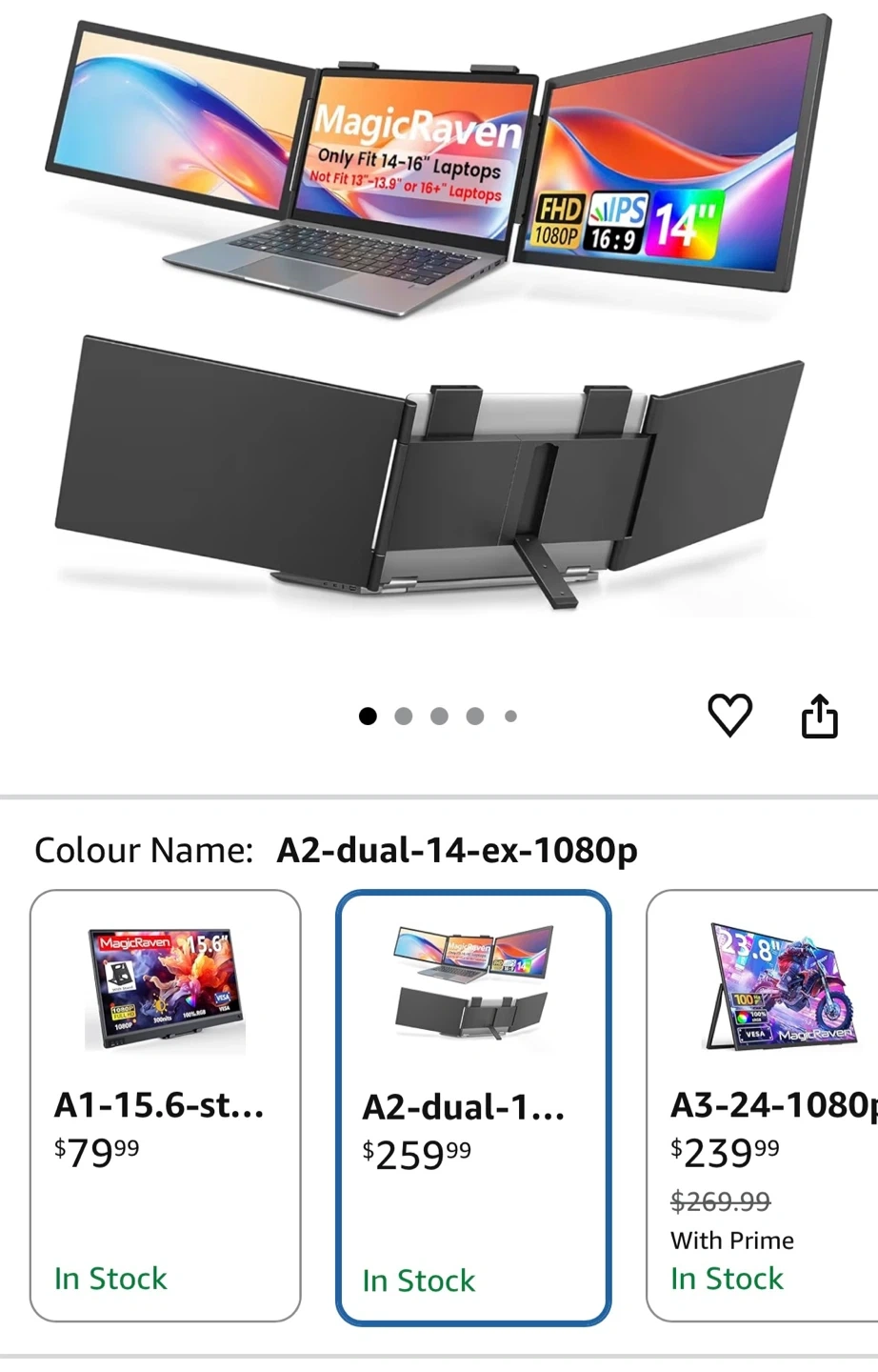 This is the MagicRaven A2 portable monitor extender. It features dual 14-inch IPS screens with FHD 1080p resolution and a 16:9 aspect ratio. It's designed to fit 14-16 inch laptops.