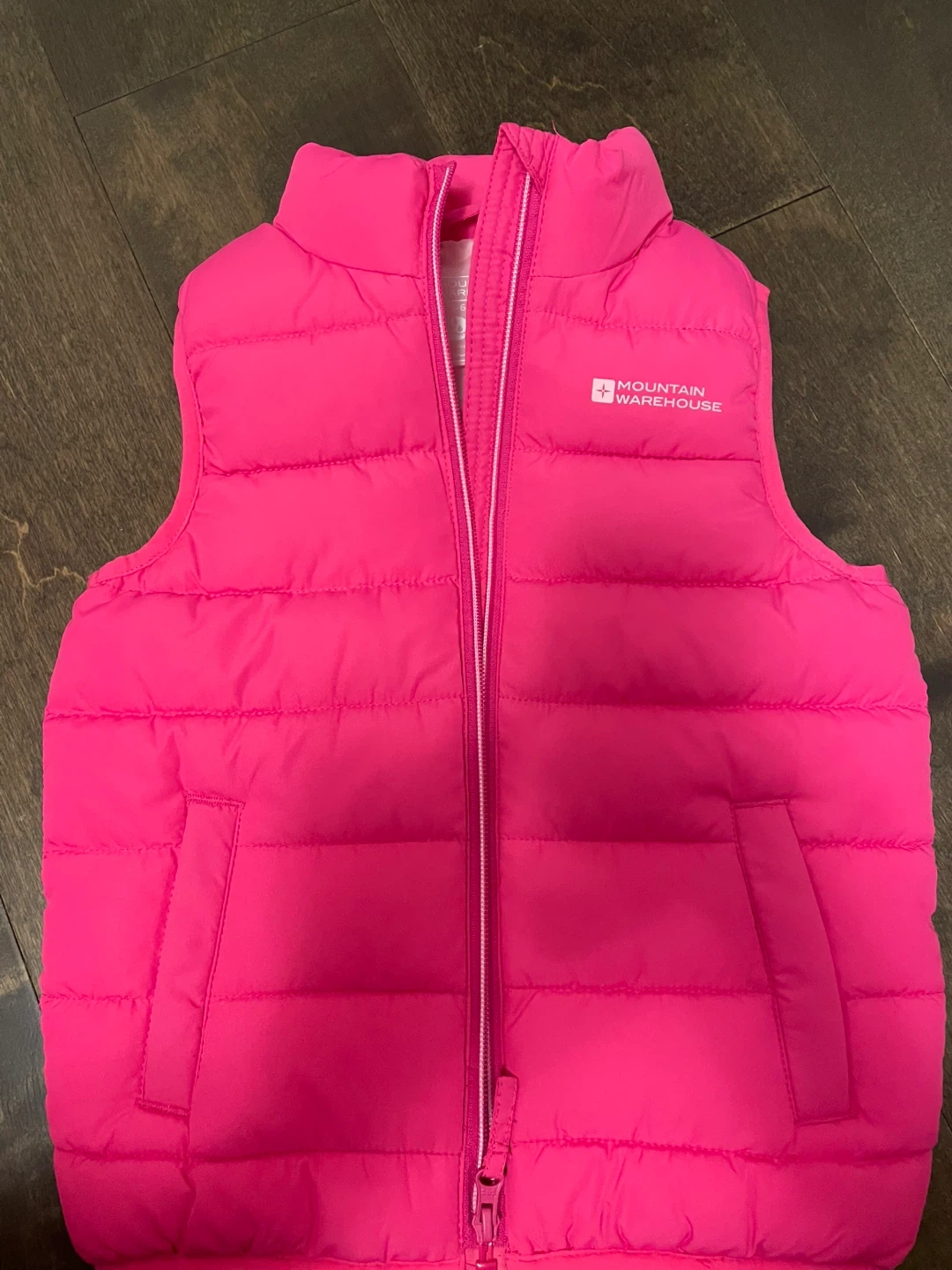 This bright pink puffer vest is from Mountain Warehouse. It's water-resistant and lightweight. Recommended for ages 5-6 years.