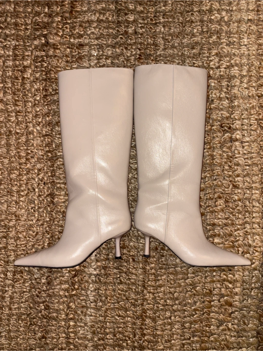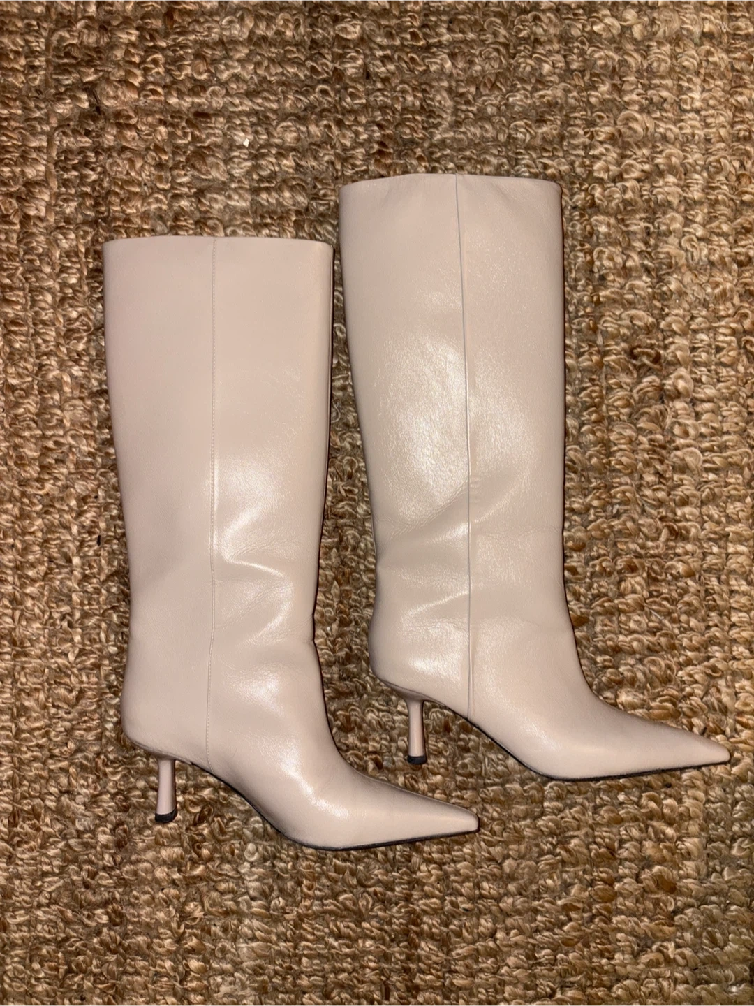 These stylish beige leather knee-high boots feature a pointed toe and a slender heel. They're made of faux leather. This footwear would be great for dressing up an outfit!